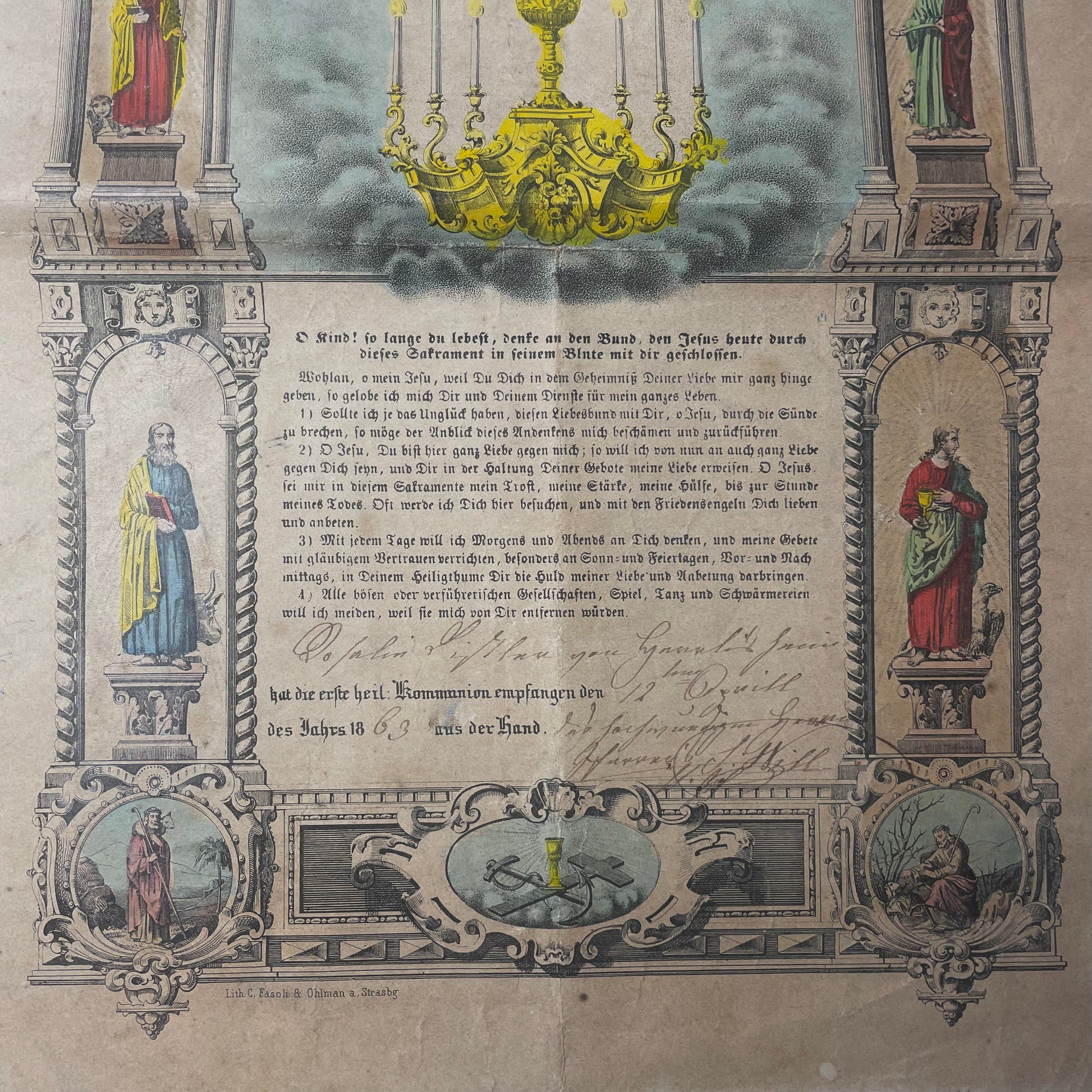 This certificate is a commitment made during a First Communion ceremony. It includes a pledge to Jesus to live a devout life, follow his commandments, and avoid temptations. The art surrounding the paper is from Lith. C. Fasoli & Ohlman a, Strasbg (Strasbourg). The name of the person making the commitment has been written on it, the date, and the name of the ecclesiastical member. This is a bit of a special piece since it's from Alsace-Lorraine. Alsace was French until 1871 when it was annexed by the German Empire after the France Prussian War. The name Alsace changed to Alsace-Lorraine. It remained German until after WWI. This piece is from 1863 but is already in German instead of French. This shows the German influence even before and official changes.