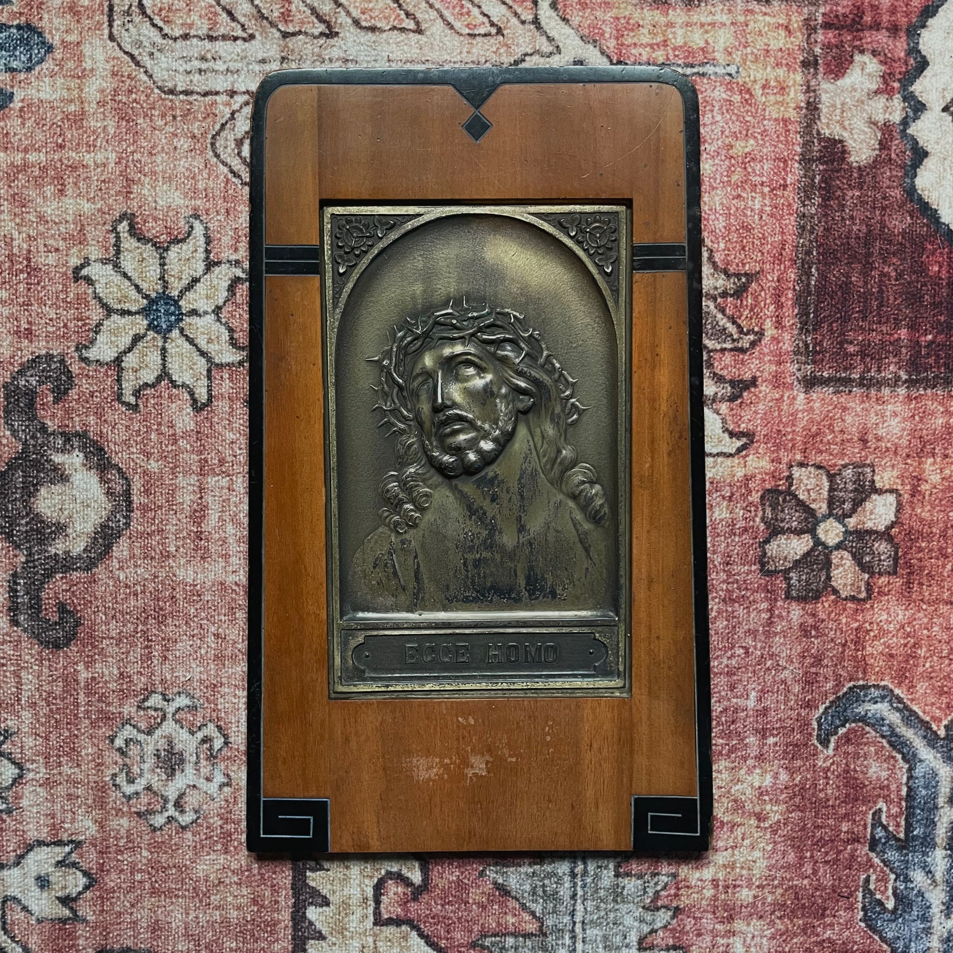 Stunning wooden plaque of Jesus Christ with the Latin phrase ''Ecce Homo'', translates to ''Behold the Man'', it refers to the words spoken by Pontius Pilate as he presented the scourged Jesus to the hostile crowd before his crucifixion, as recorded in the Gospel of John (John 19:5). The wooden frame is decorated with a simple art deco style.