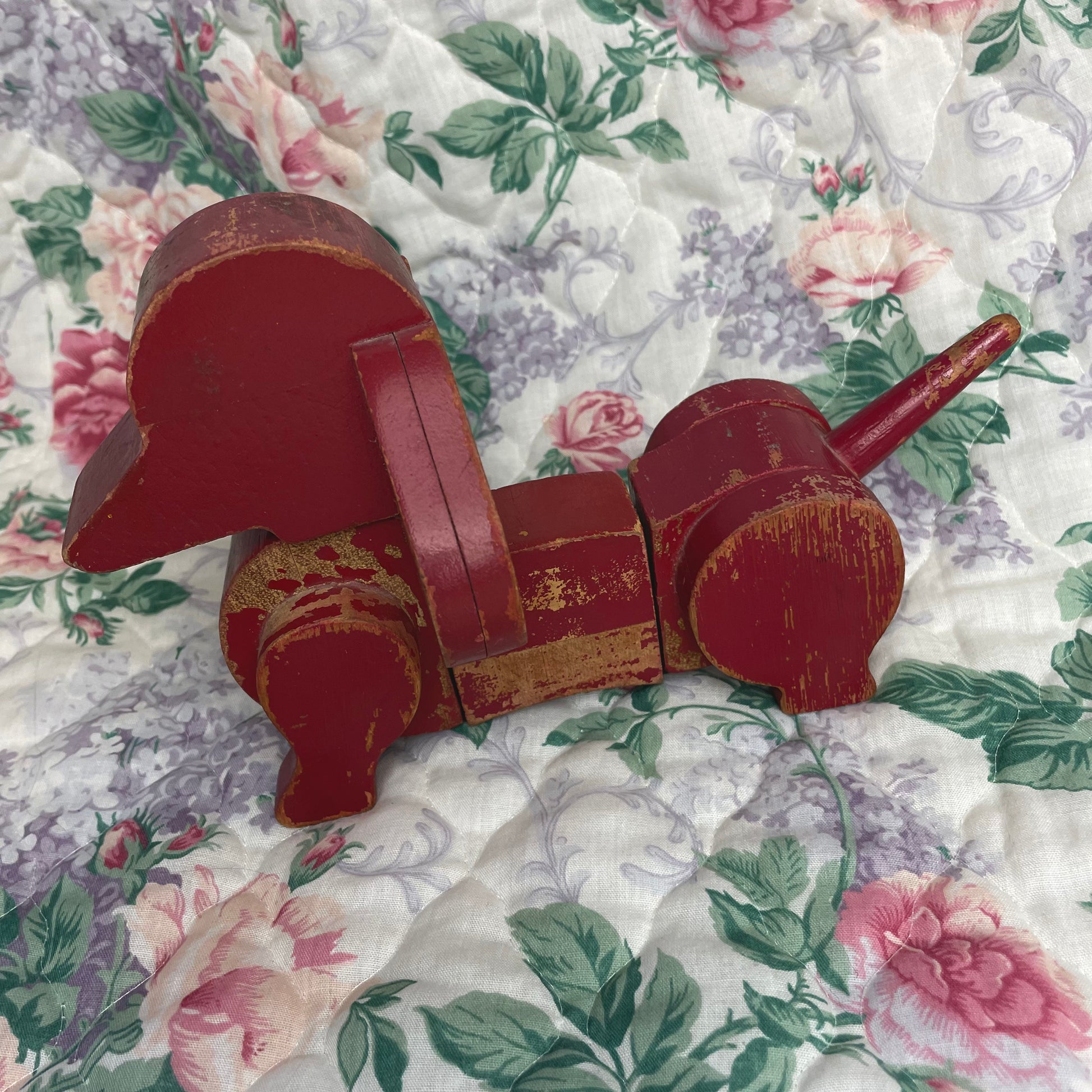 Cute and playful Mattel dachshund toy from 1971. A fun little puzzle with some humor to it. Made from wood in Taiwan.