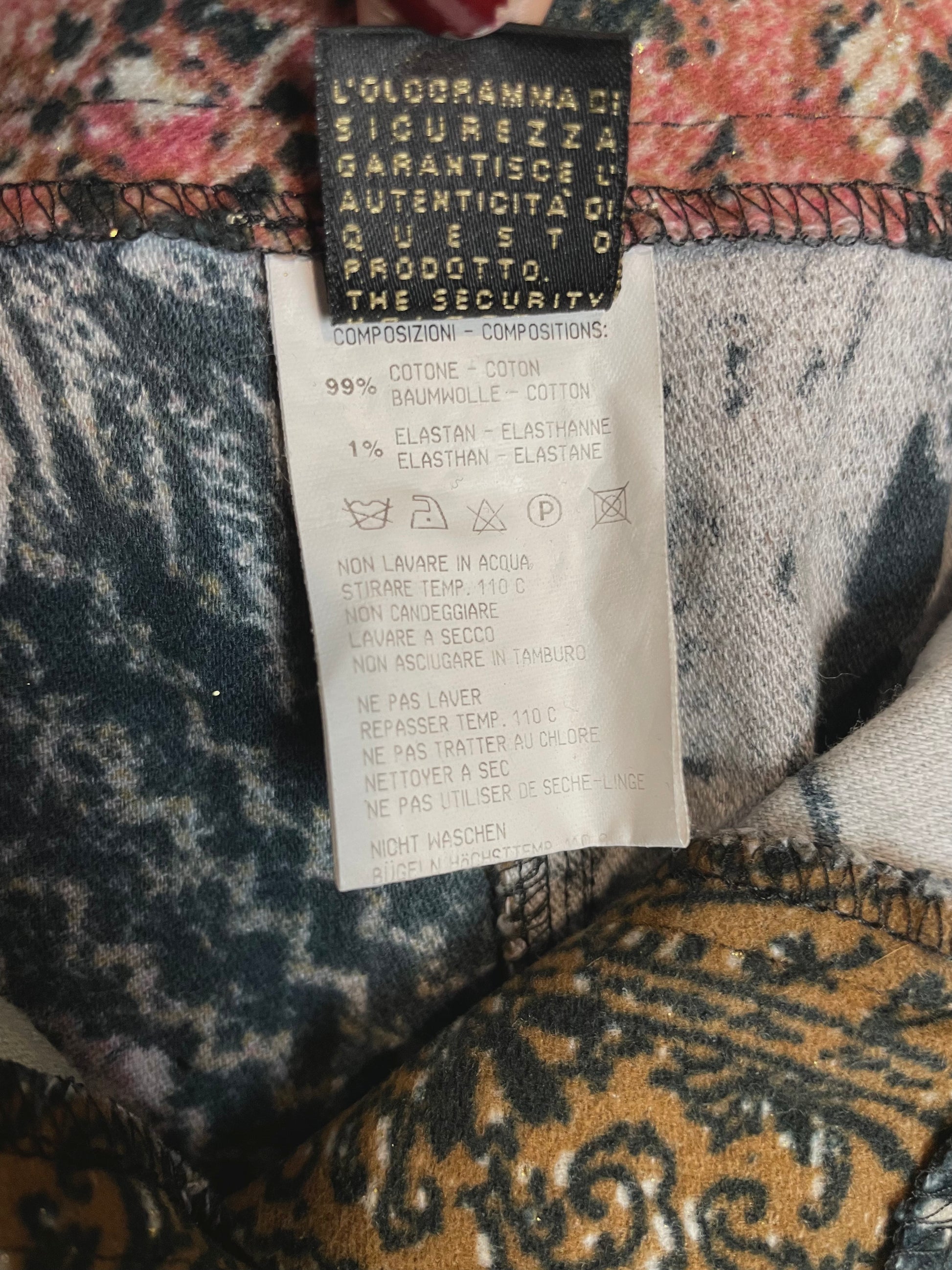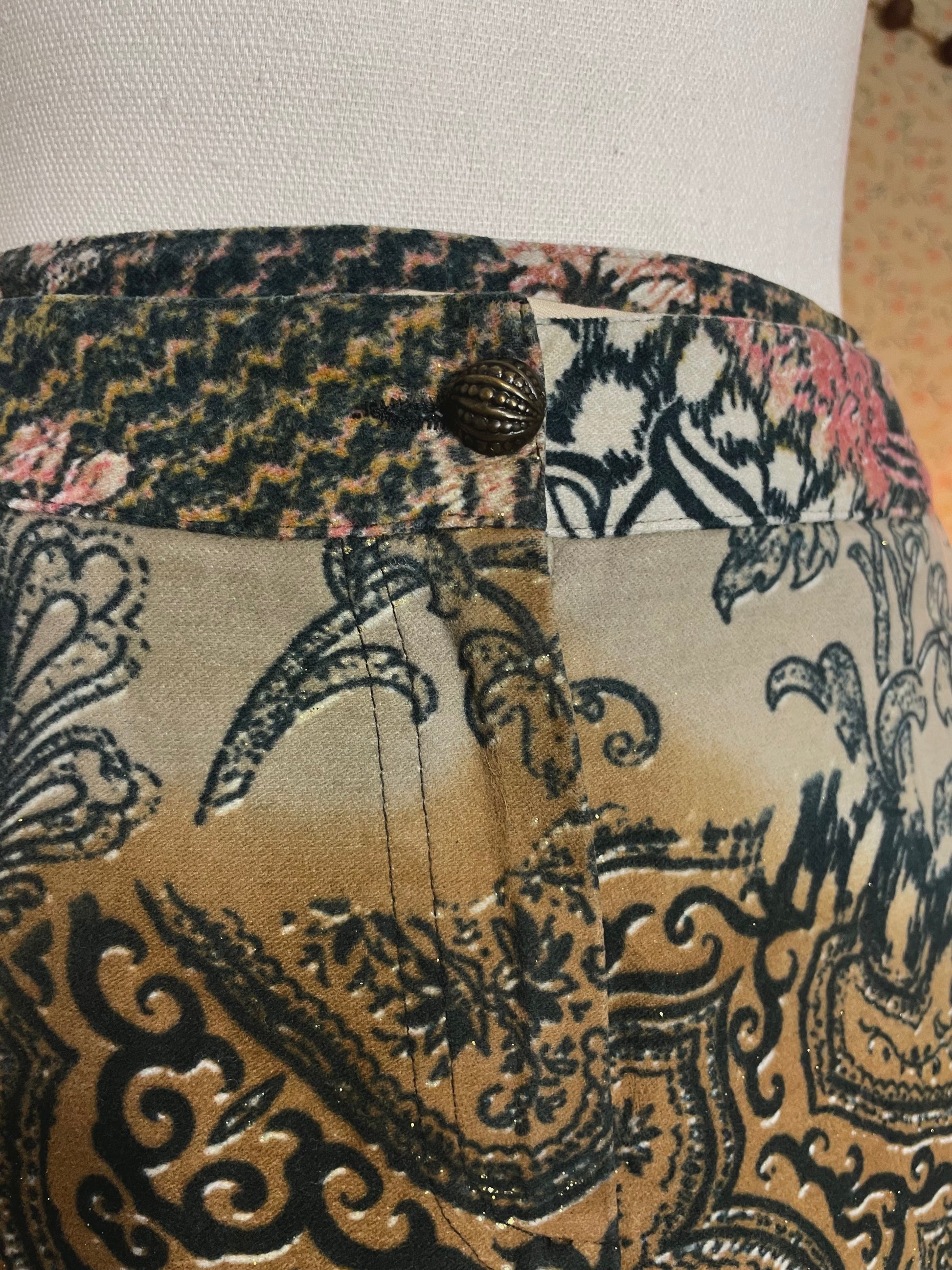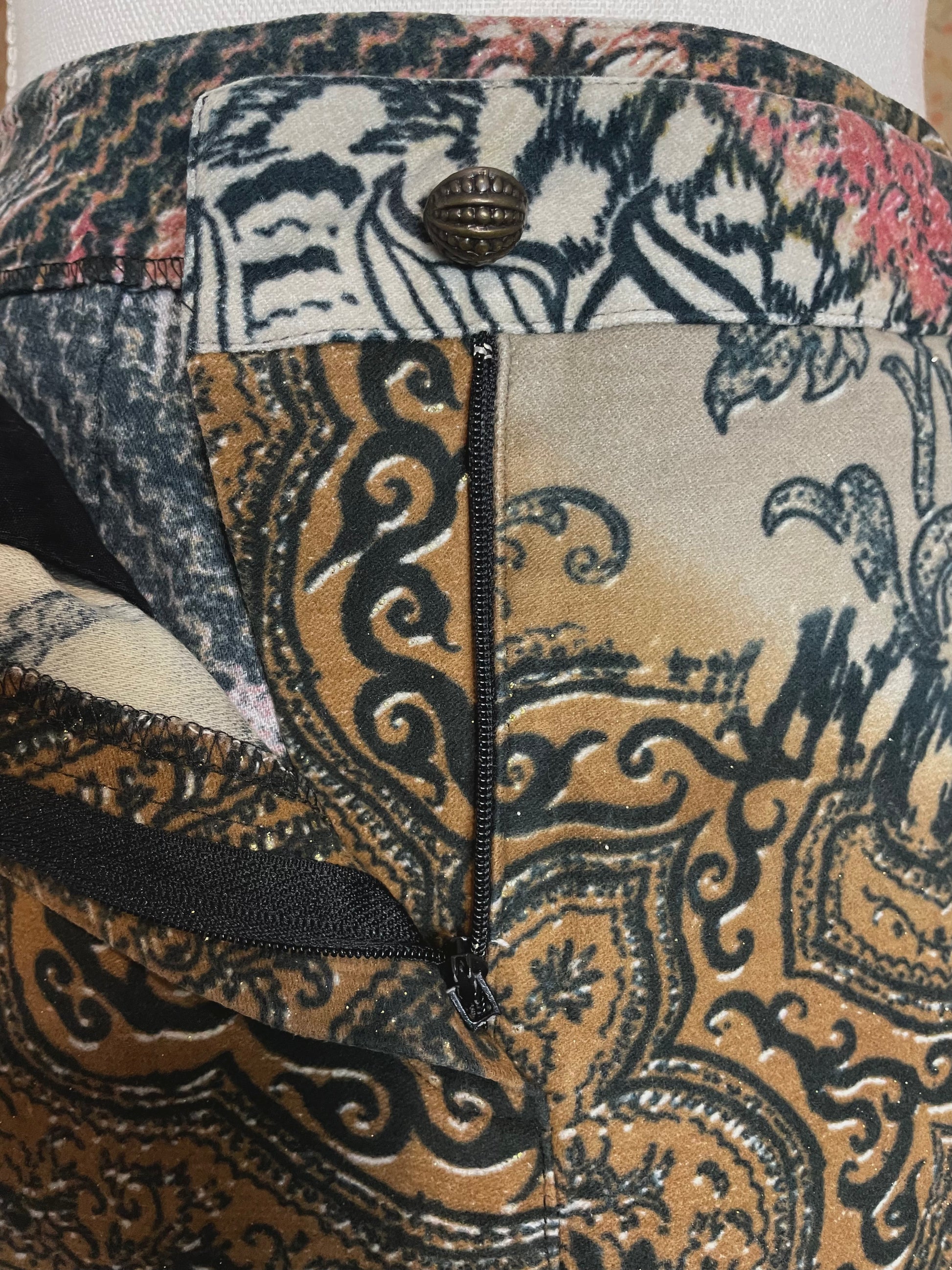 Meet this 2000s Roberto Cavalli beauty, an absolute icon. Beautiful and typical Cavalli print with light glitters and a velvet line along the legs. Original button and zipper, note the zipper pull is broken but this does not affect the wearability.