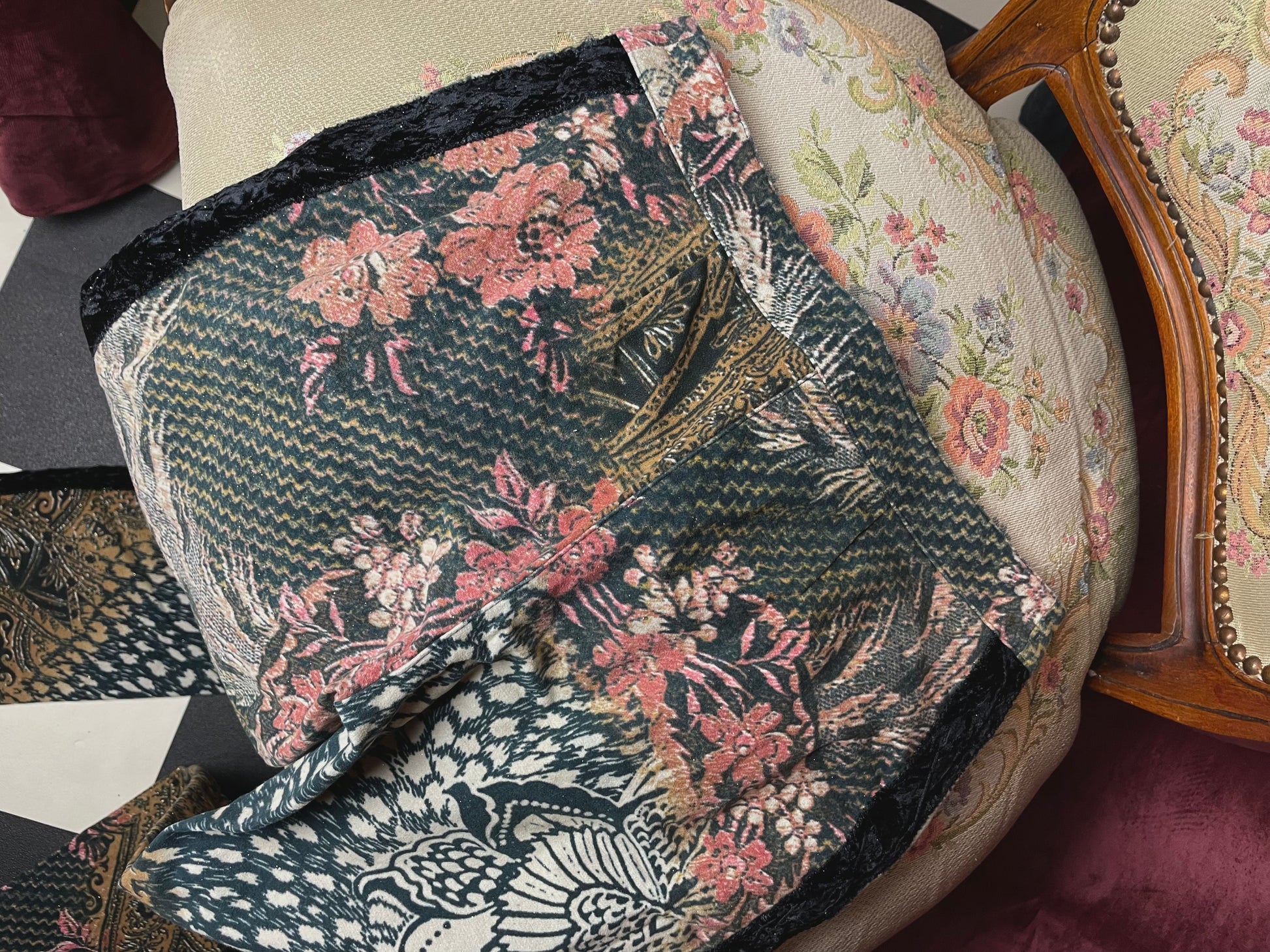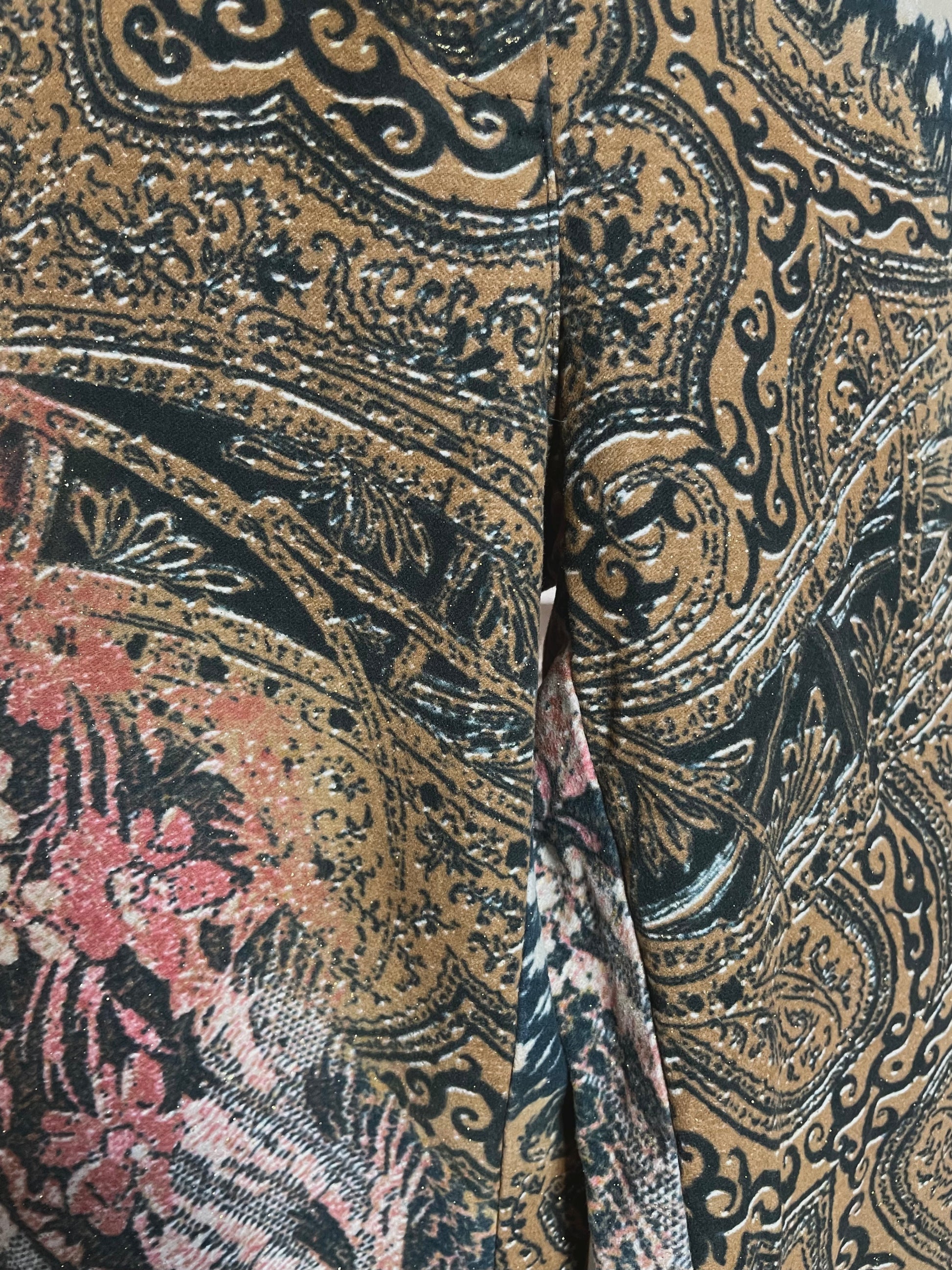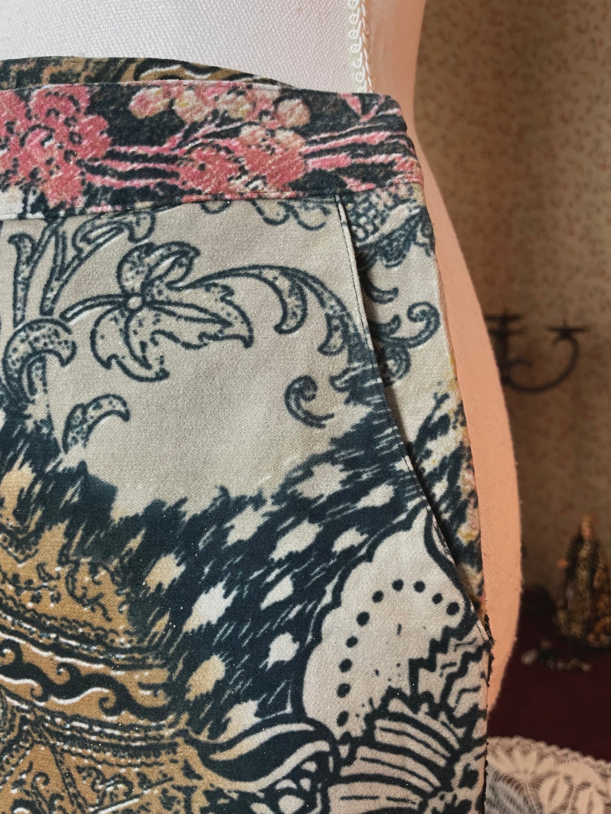 Meet this 2000s Roberto Cavalli beauty, an absolute icon. Beautiful and typical Cavalli print with light glitters and a velvet line along the legs. Original button and zipper, note the zipper pull is broken but this does not affect the wearability.