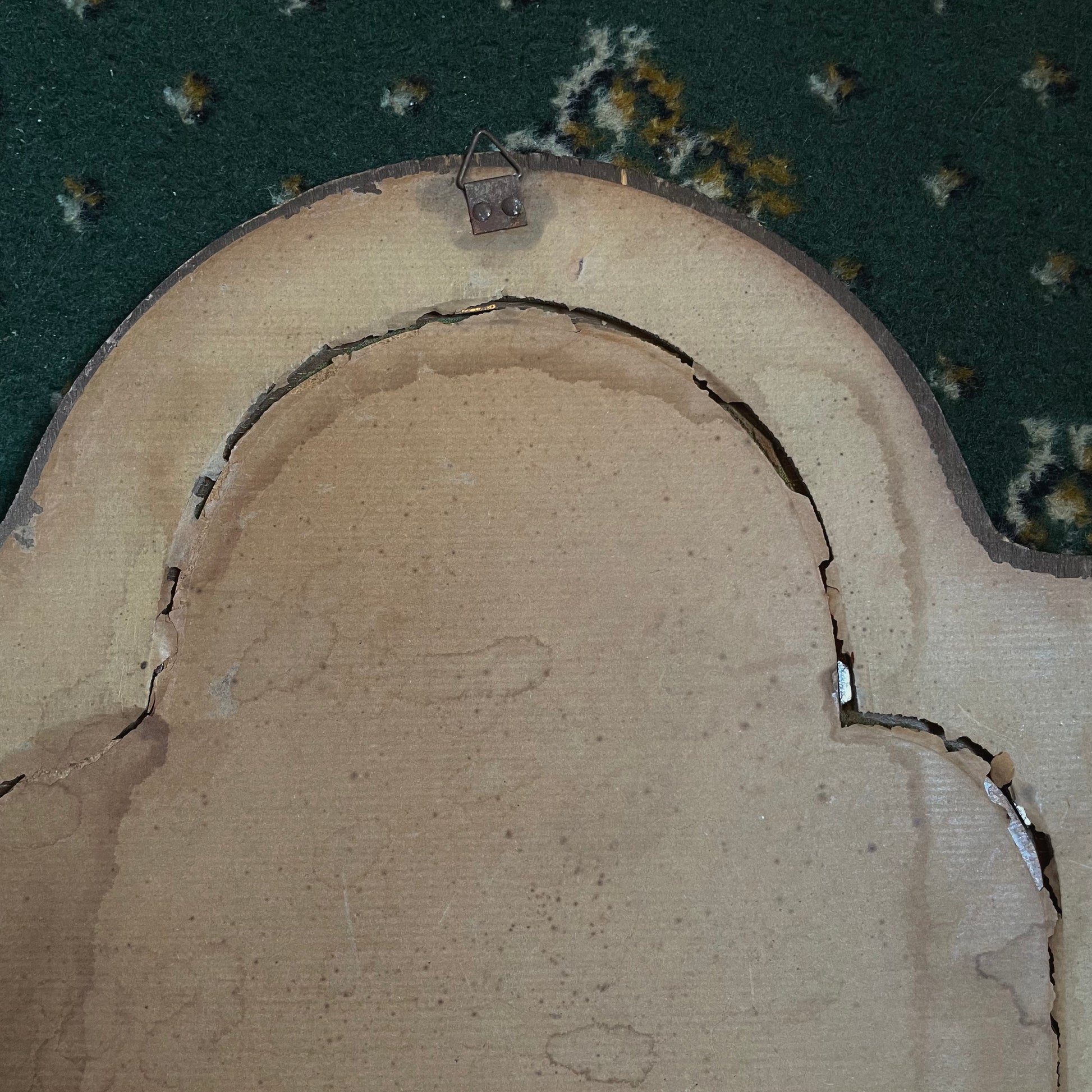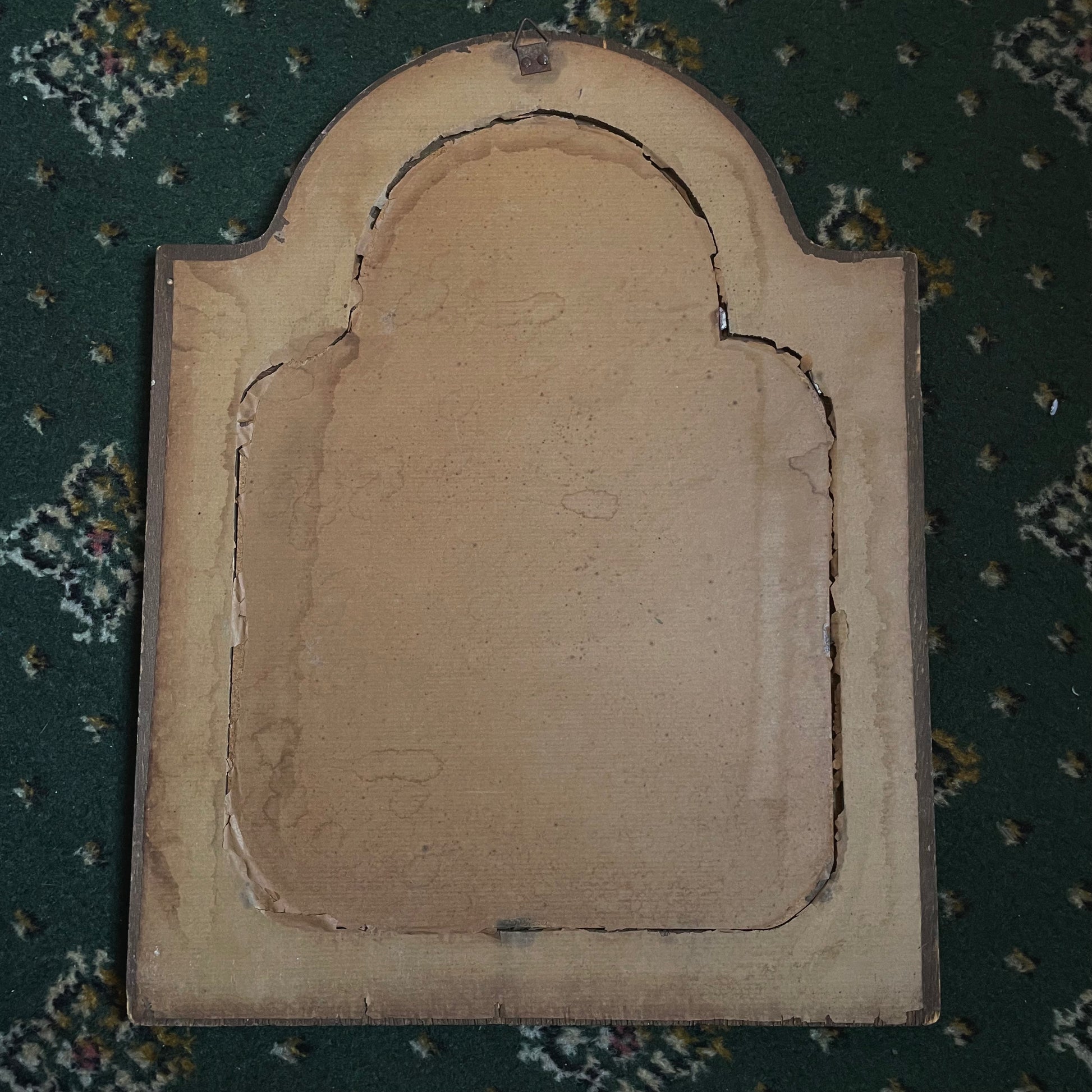 1930s wall plaque depicting Madonna and child from Italy. The sculpture is silver plated, mounted a darker green velvet background within an arched wooden frame.
