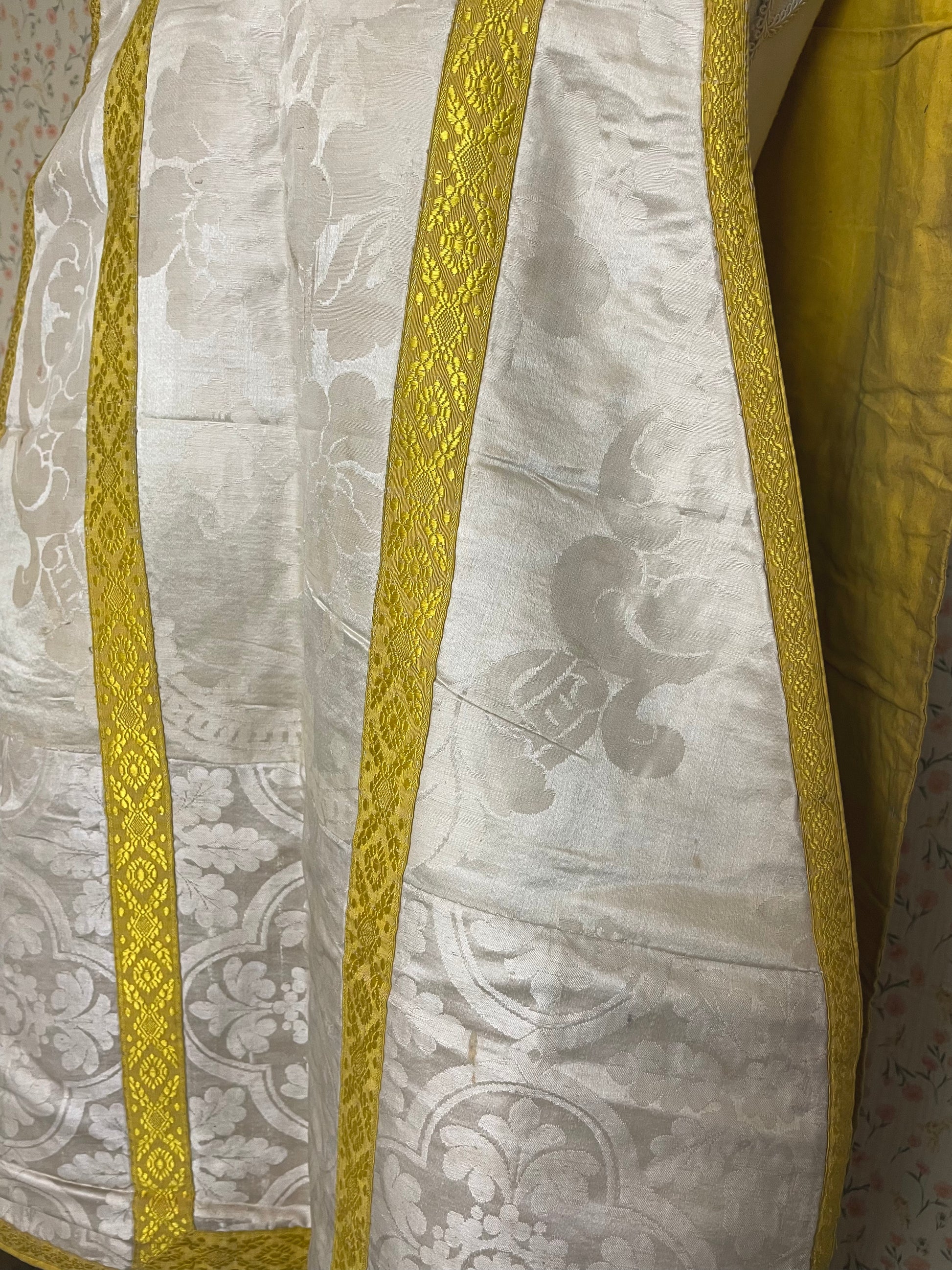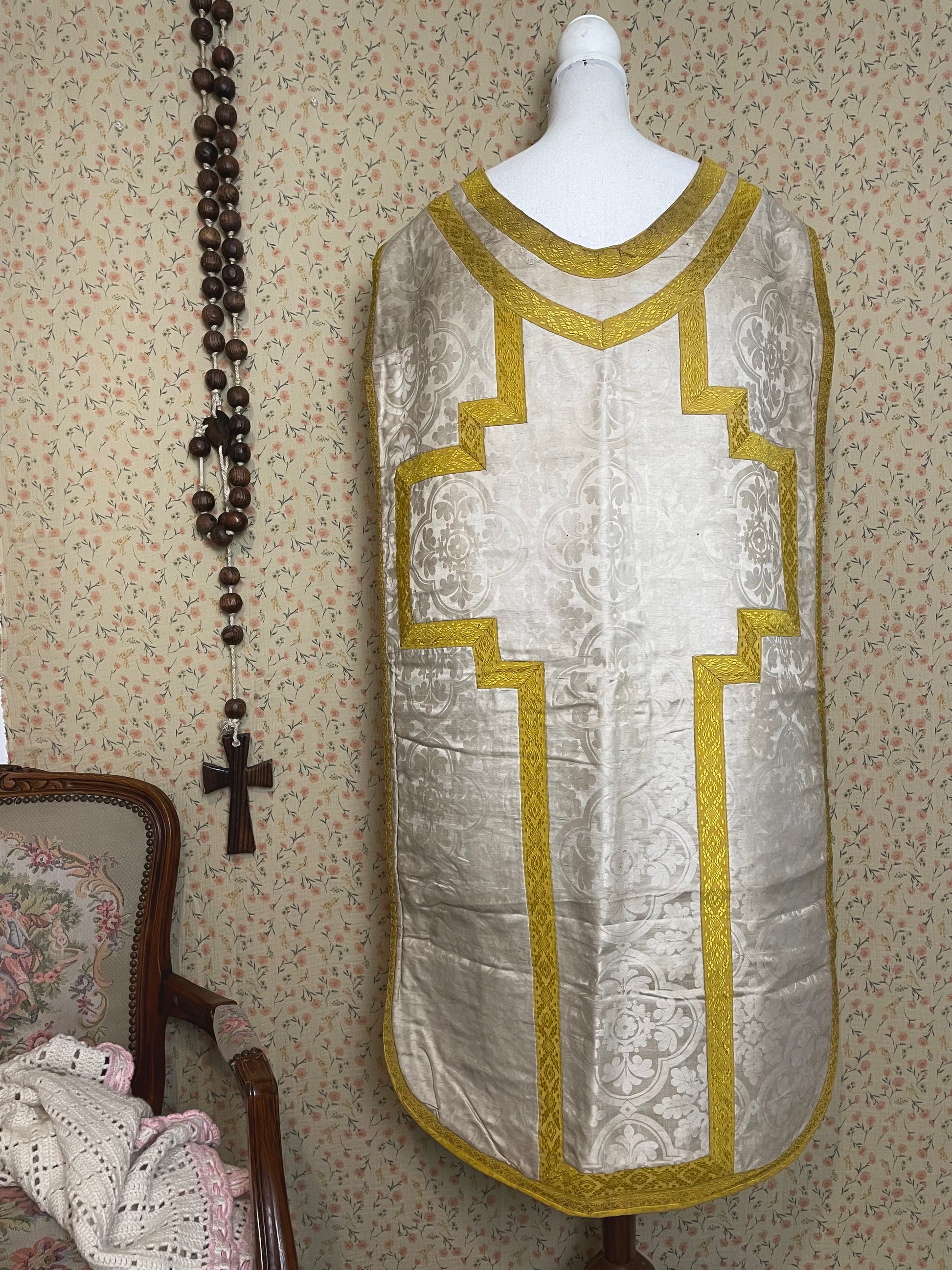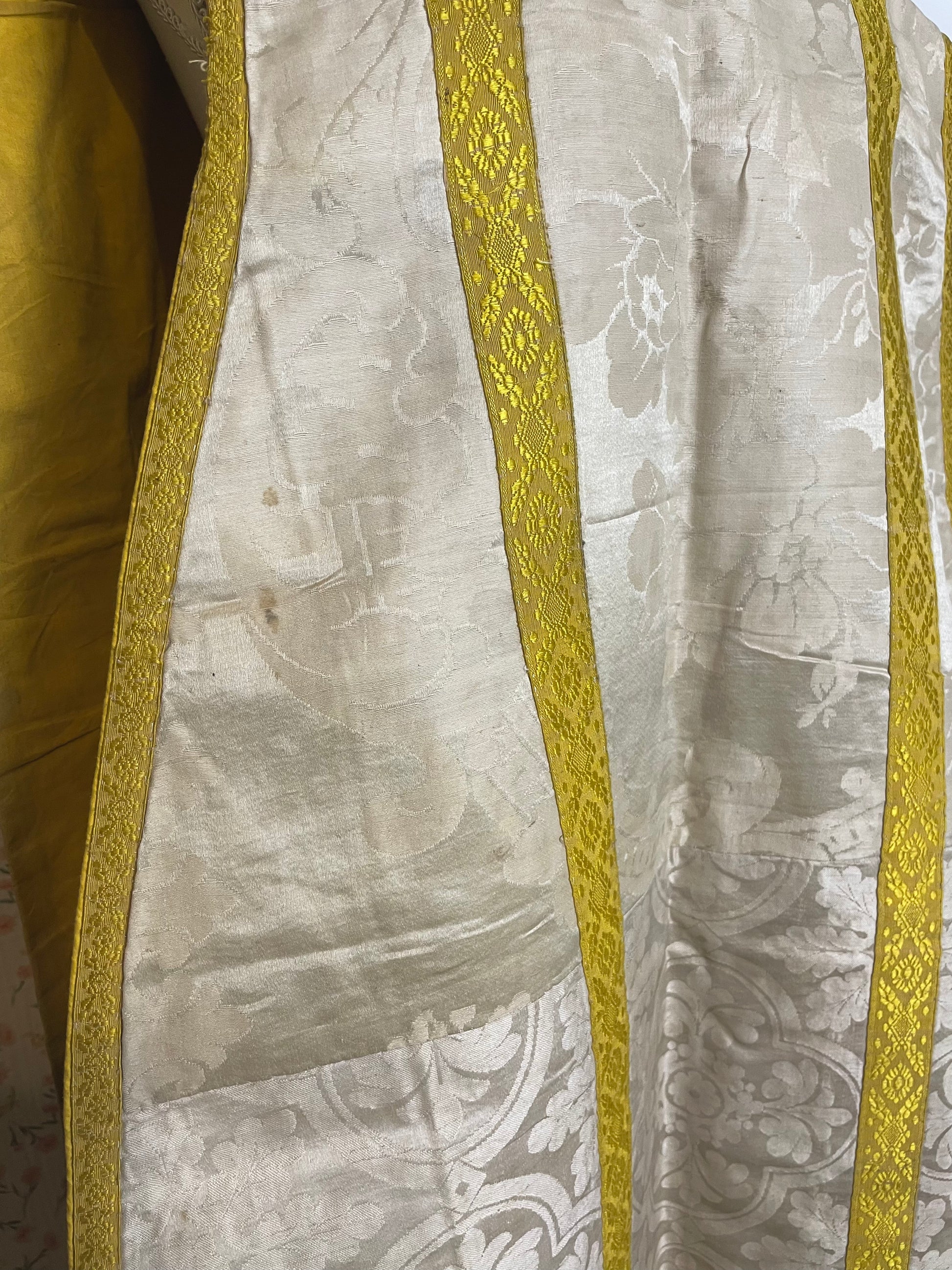 This particular chasuble is made out of silk and ribbon. Keep in mind this is an item that has been loved, used and respected. Do not expect a squeaky clean garment. It has visible usage and age. It's simply a magnificent item with a long history.