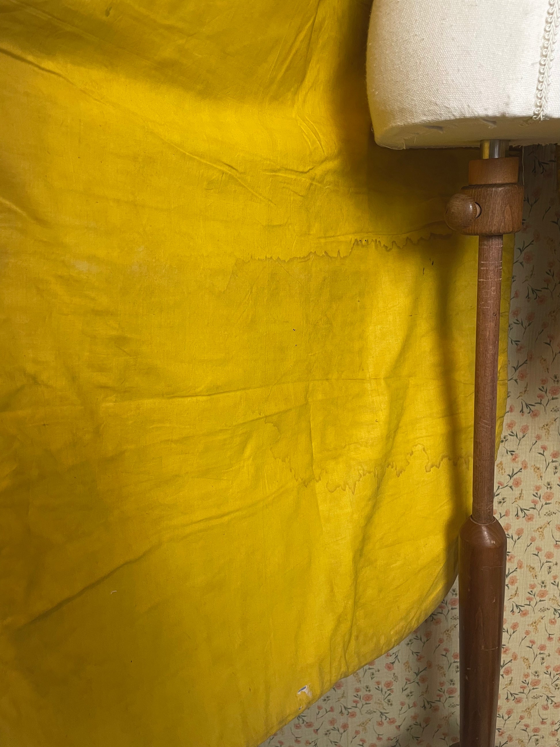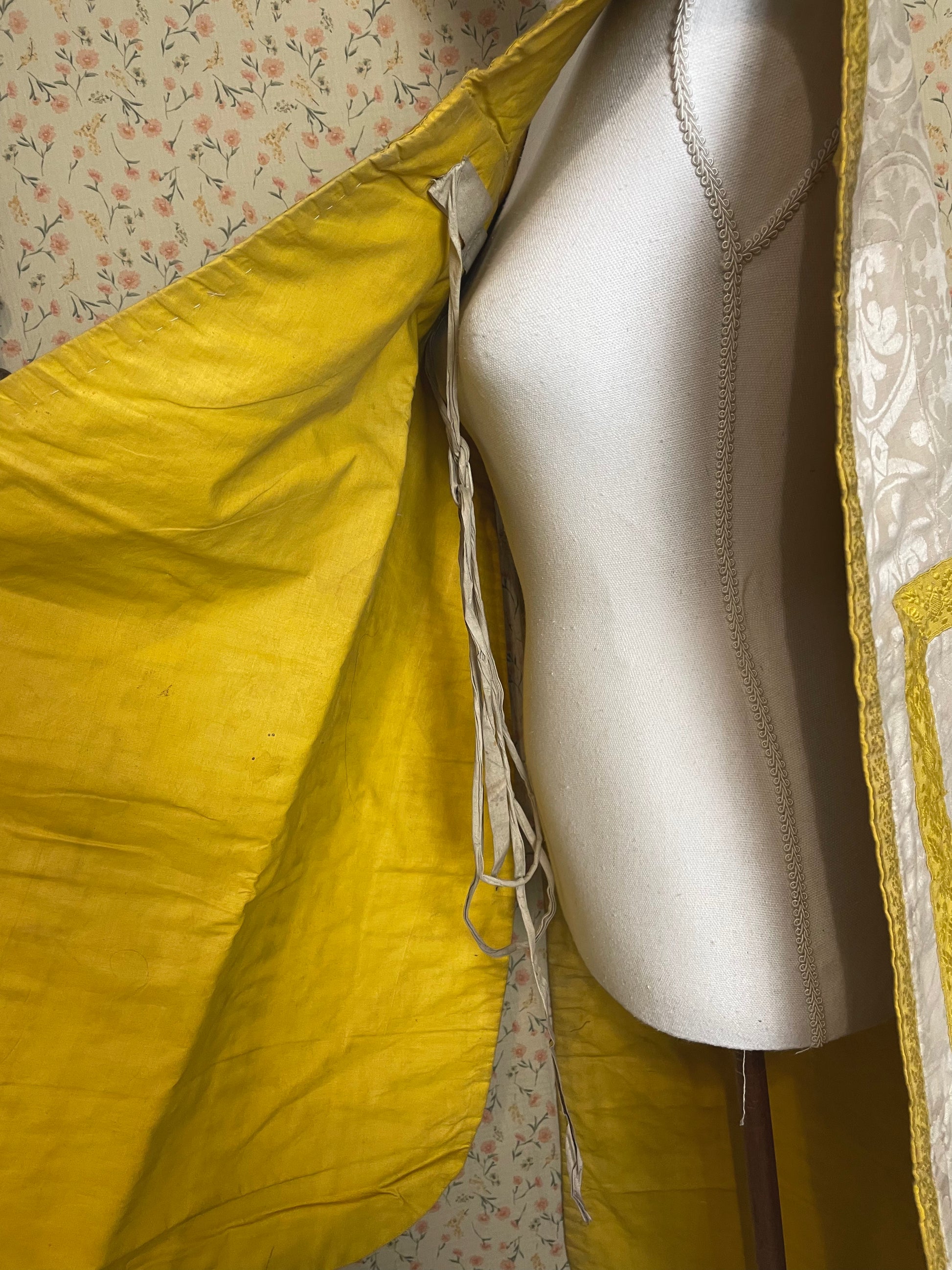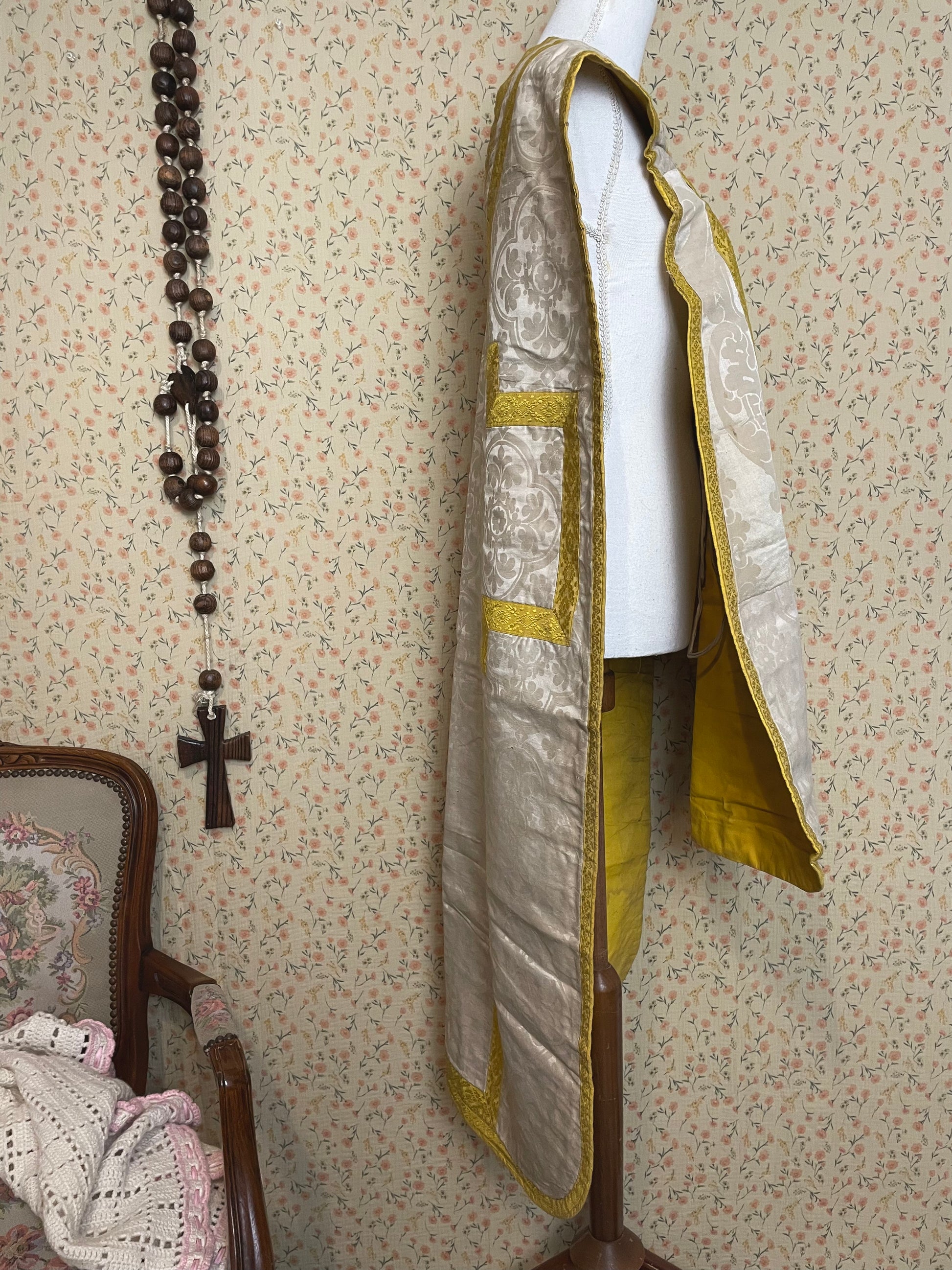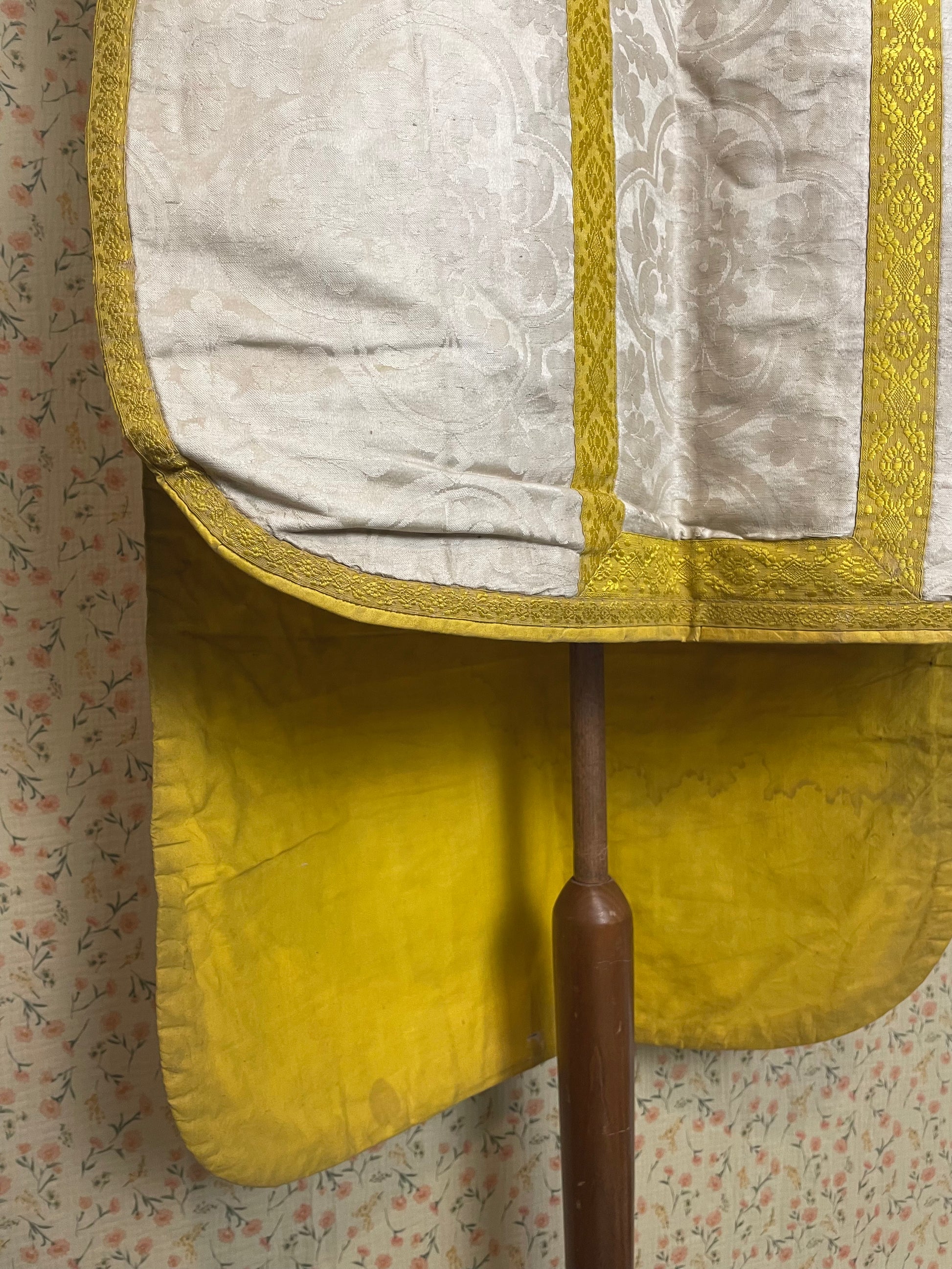 This particular chasuble is made out of silk and ribbon. Keep in mind this is an item that has been loved, used and respected. Do not expect a squeaky clean garment. It has visible usage and age. It's simply a magnificent item with a long history.