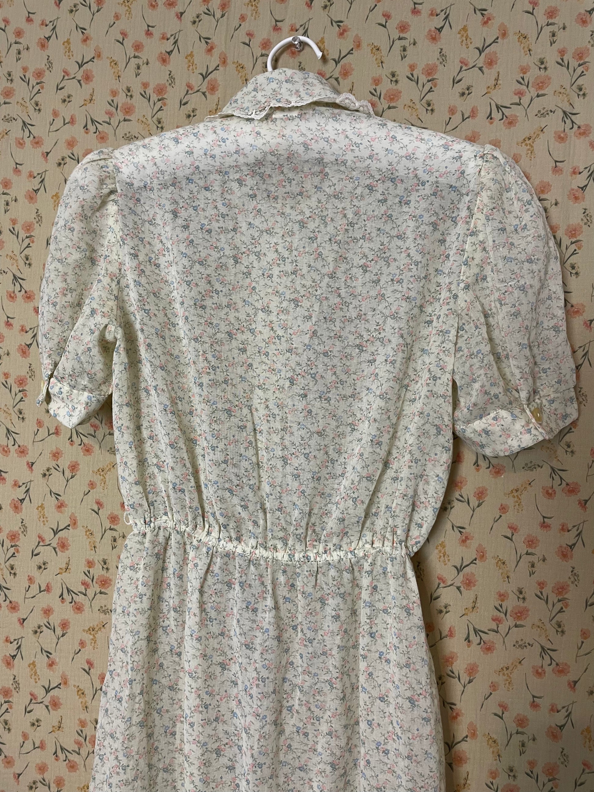 Meet this 1950s sweetheart, a floral treasure. Cotton blend fabric with lovely off-white lace. Slightly see-through, the dress has a button closure on the front.