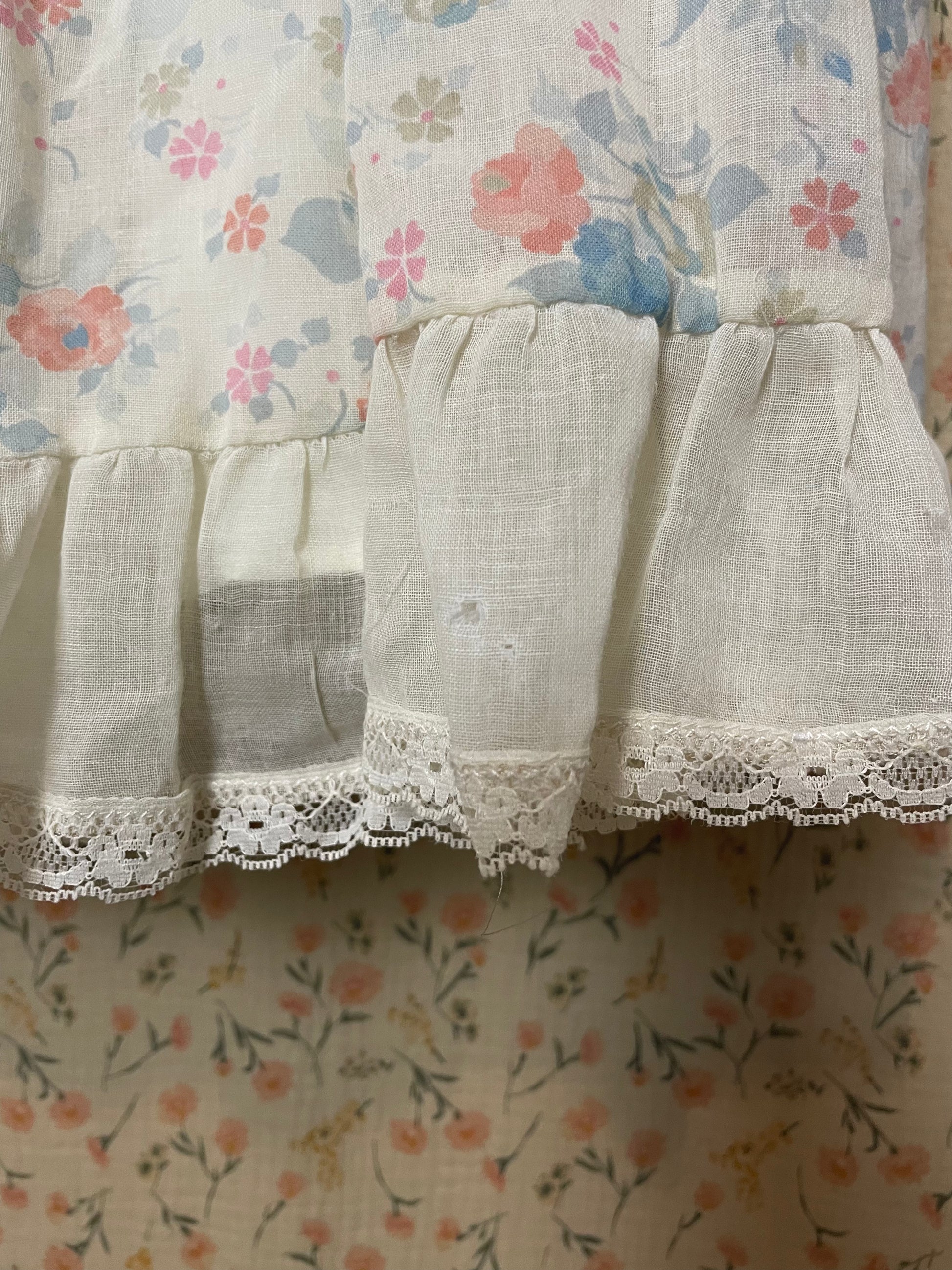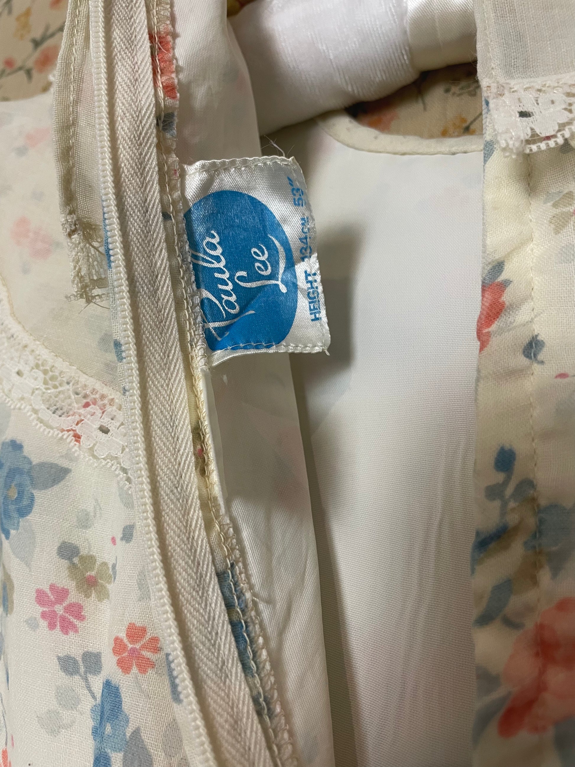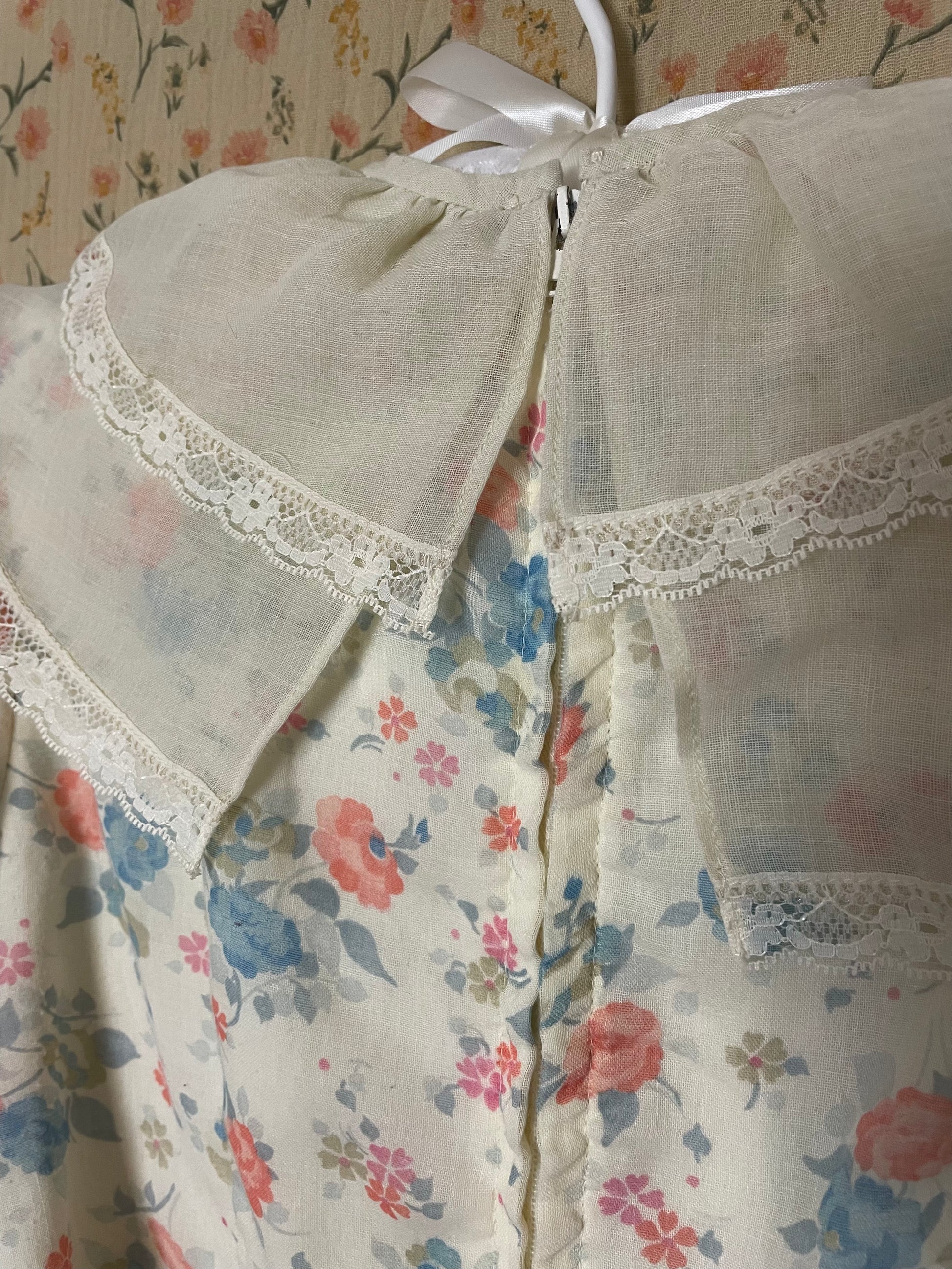 Meet this 1970s sweetheart, a lovely dress worn for communion. Cotton fabric with a lovely creme lace collar for a doll-like look. The little lace details and flower pattern along the dress makes this dress a dream for every little girl. Zipper is in perfect condition, dark blue velvet bow gives an extra little sweet touch.