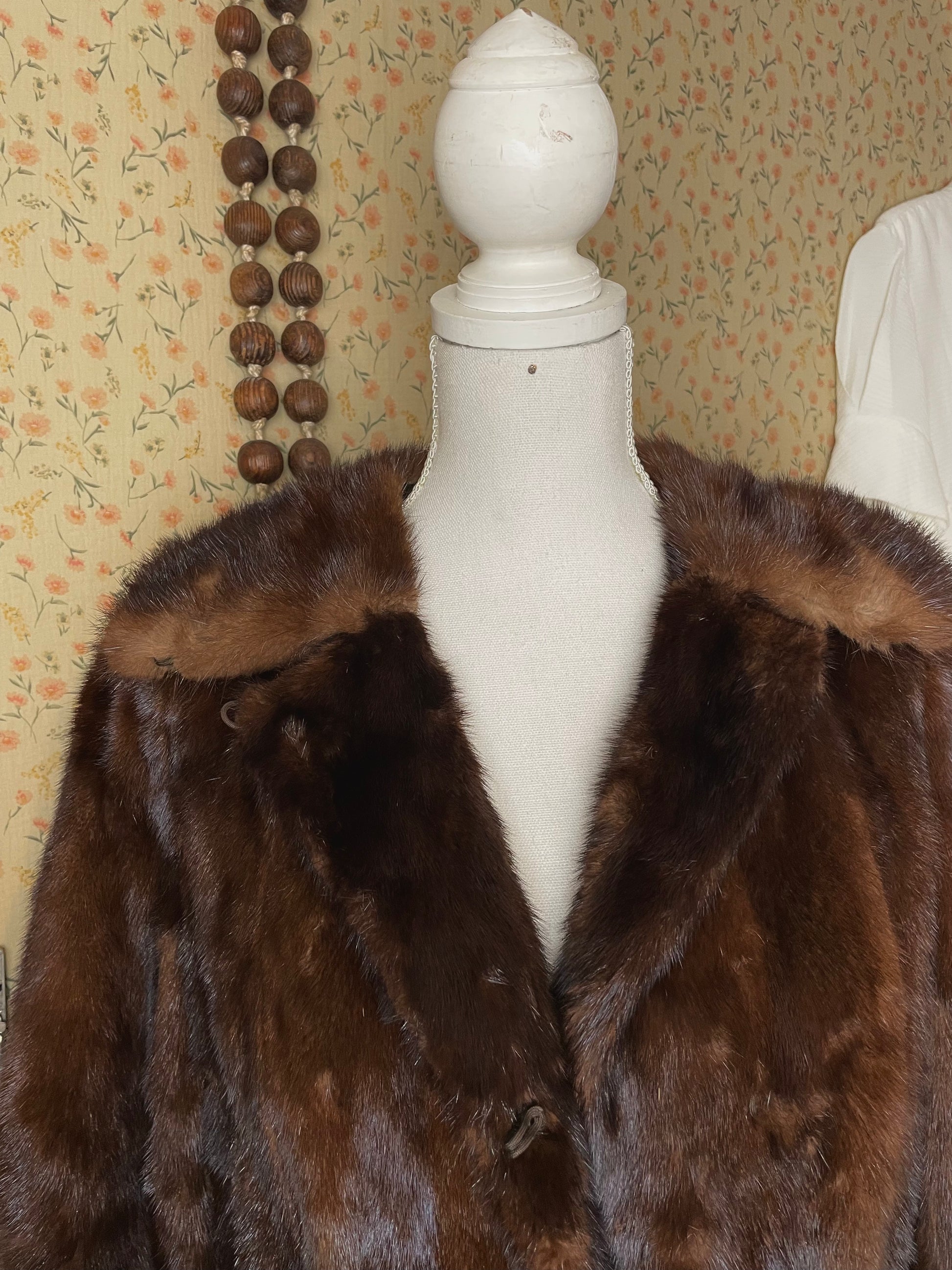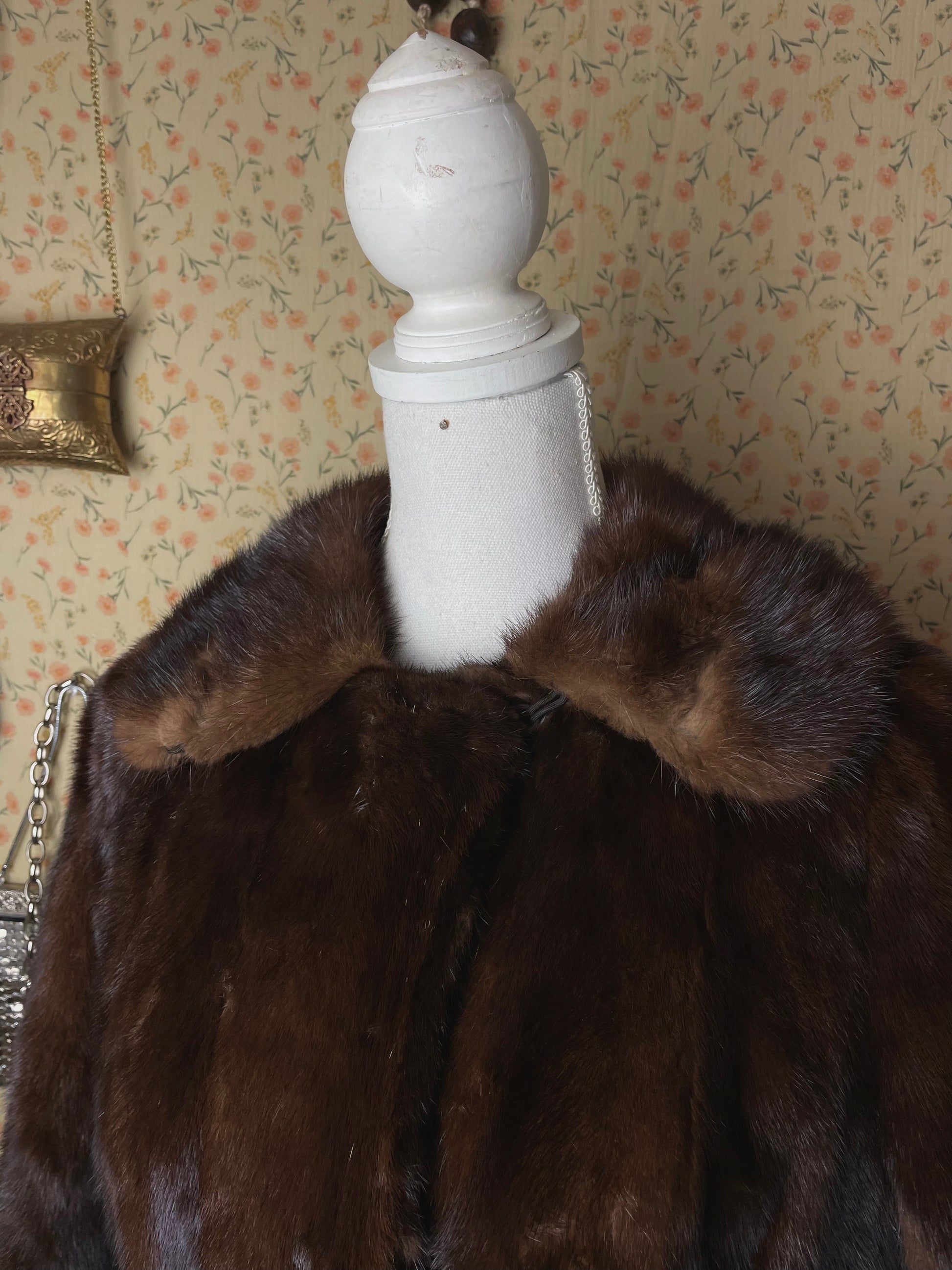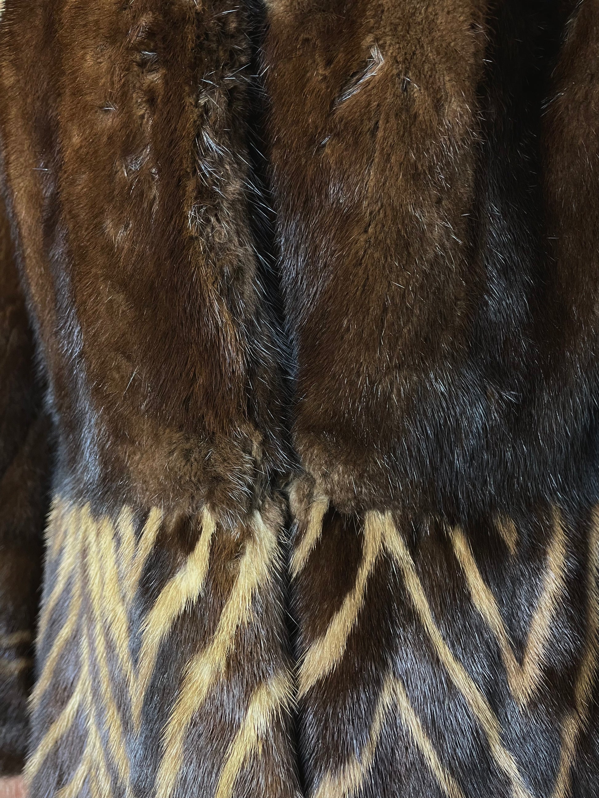 Meet this 1970s beauty. 100% mink fur with an eclectic chevron pattern. Soft but a bit mysterious and effortlessly elegant. All closures are in great condition, the coat can be worn in two different ways on the top. Comes with 2 lined pockets.