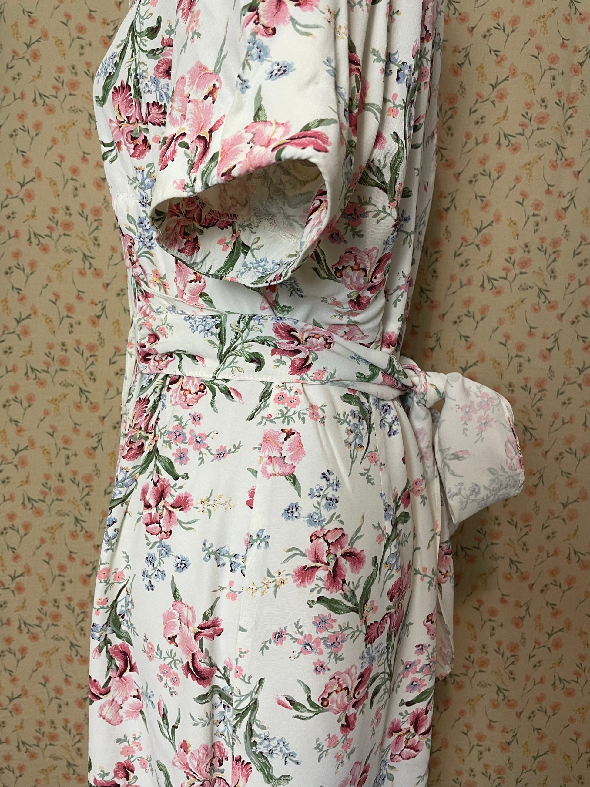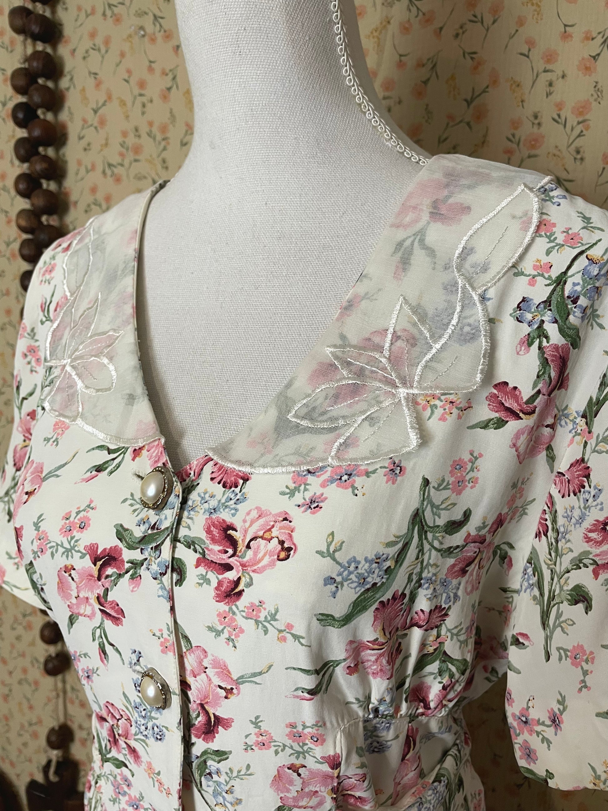 Meet this 1980s beauty, a fun Brioche California treasure. Beautiful pink flowers pattern with a lovely white lace collar for a doll-like look. Effortlessly elegant and easy to put on with the buttons on the front. Waist can be cinched in with the straps. The last button is missing, this does not affect the wearability of the dress. (See photo)