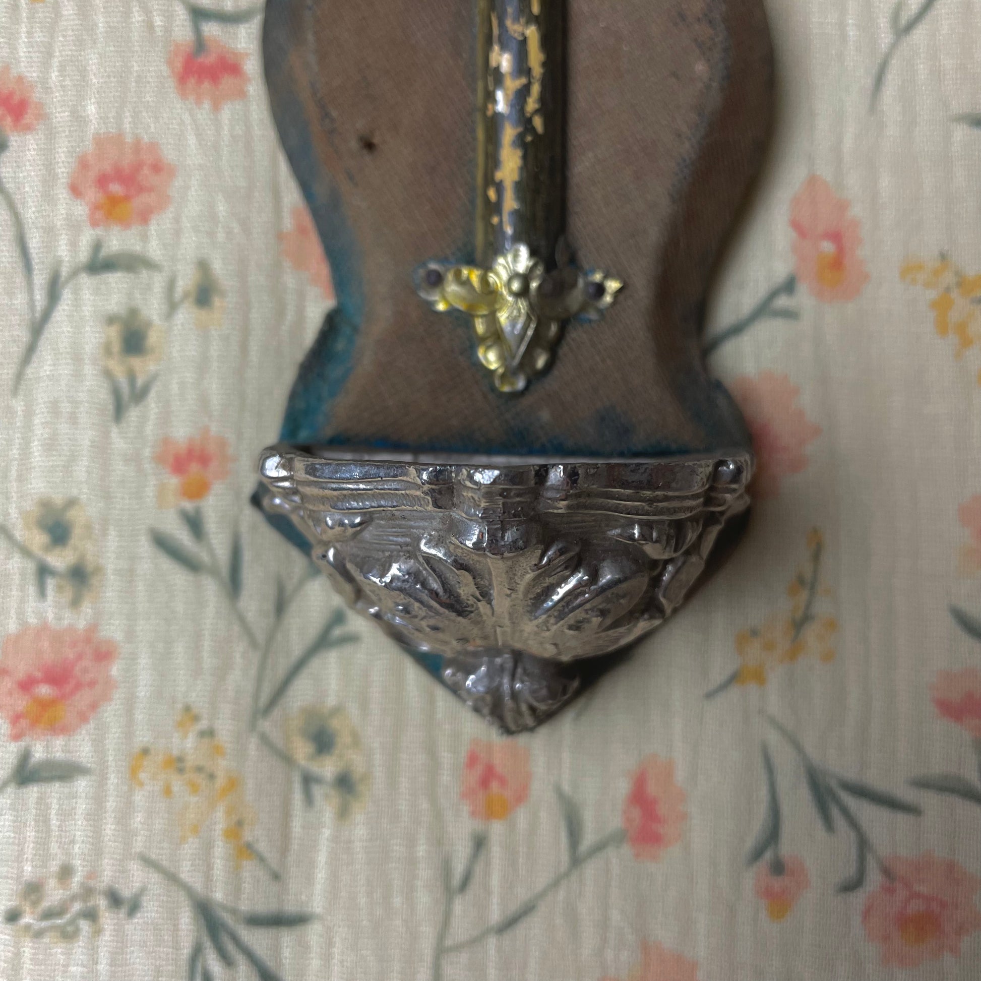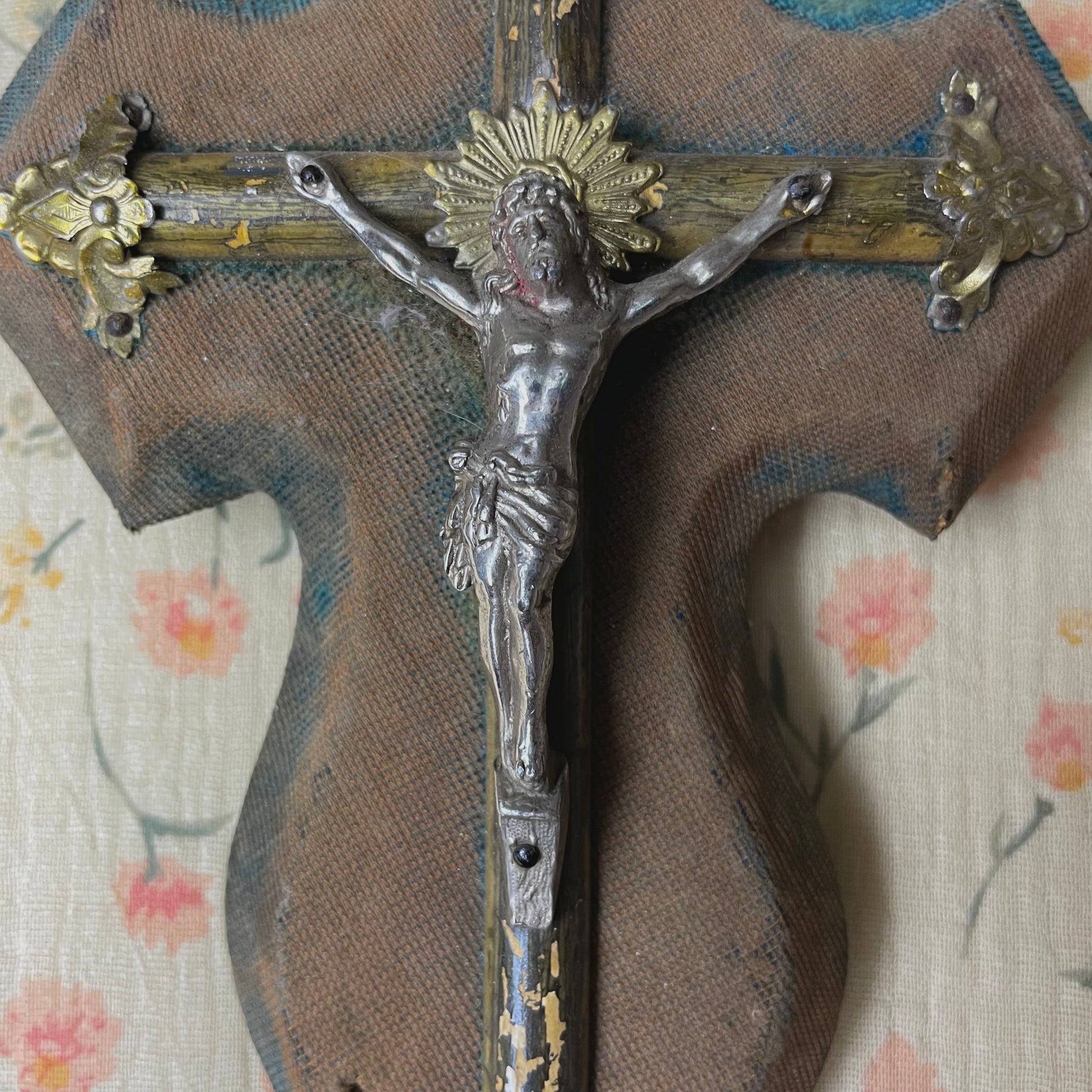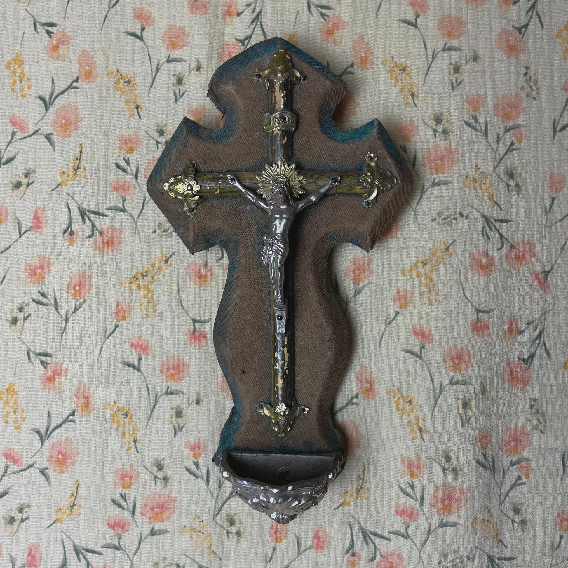 Adorned holy water font with crucified Christ in metal, resting on a cross-shaped wooden base covered with blue fabric (discoloured).