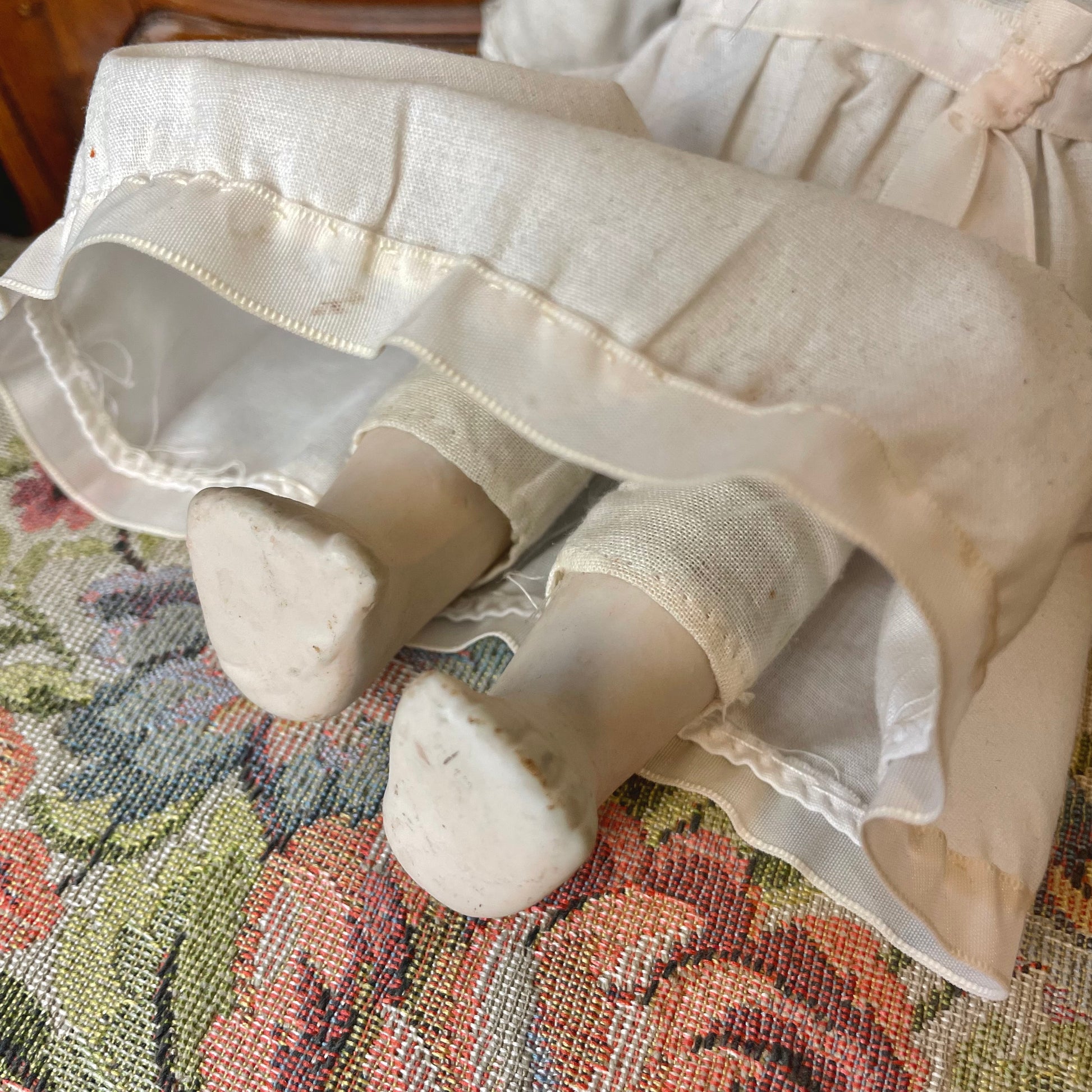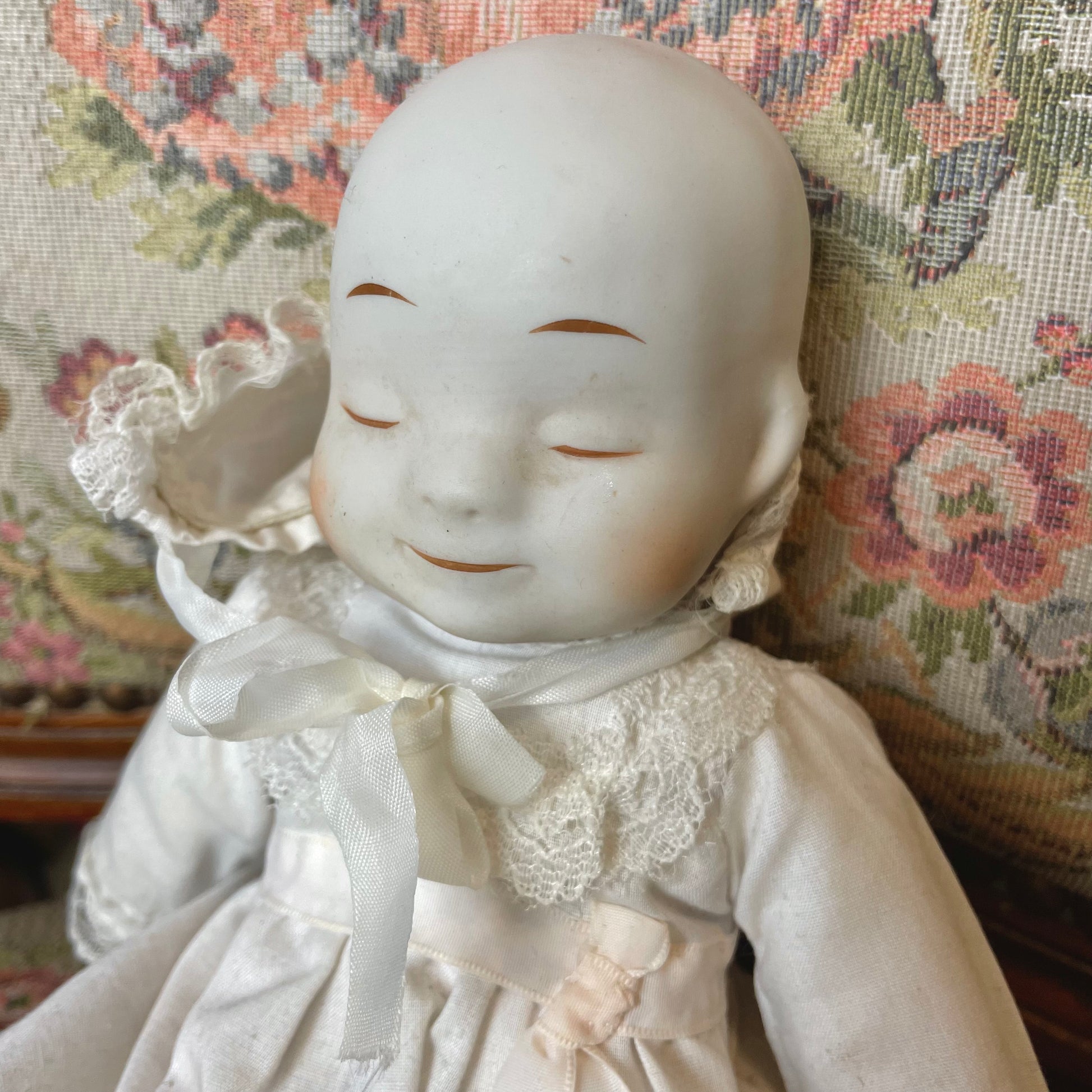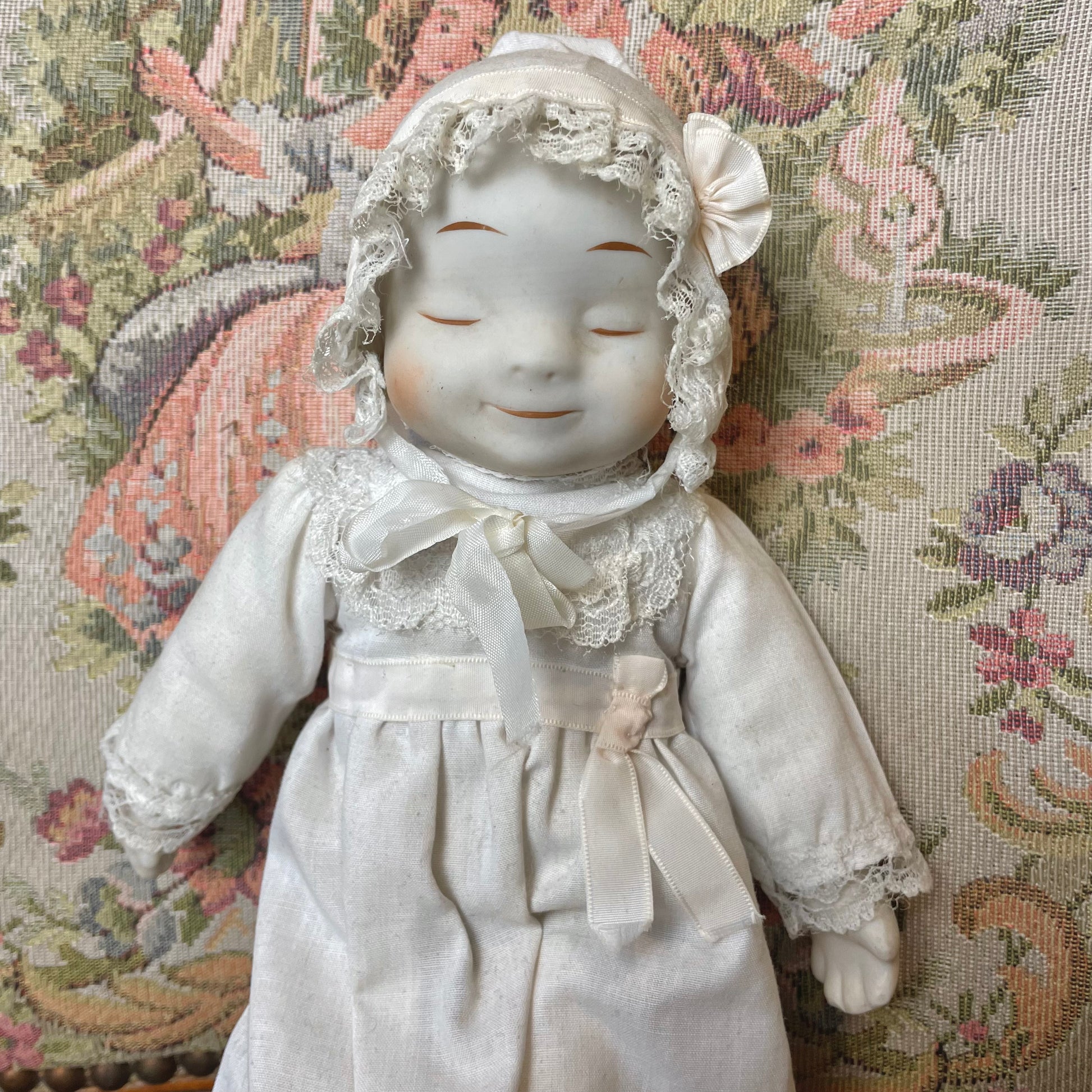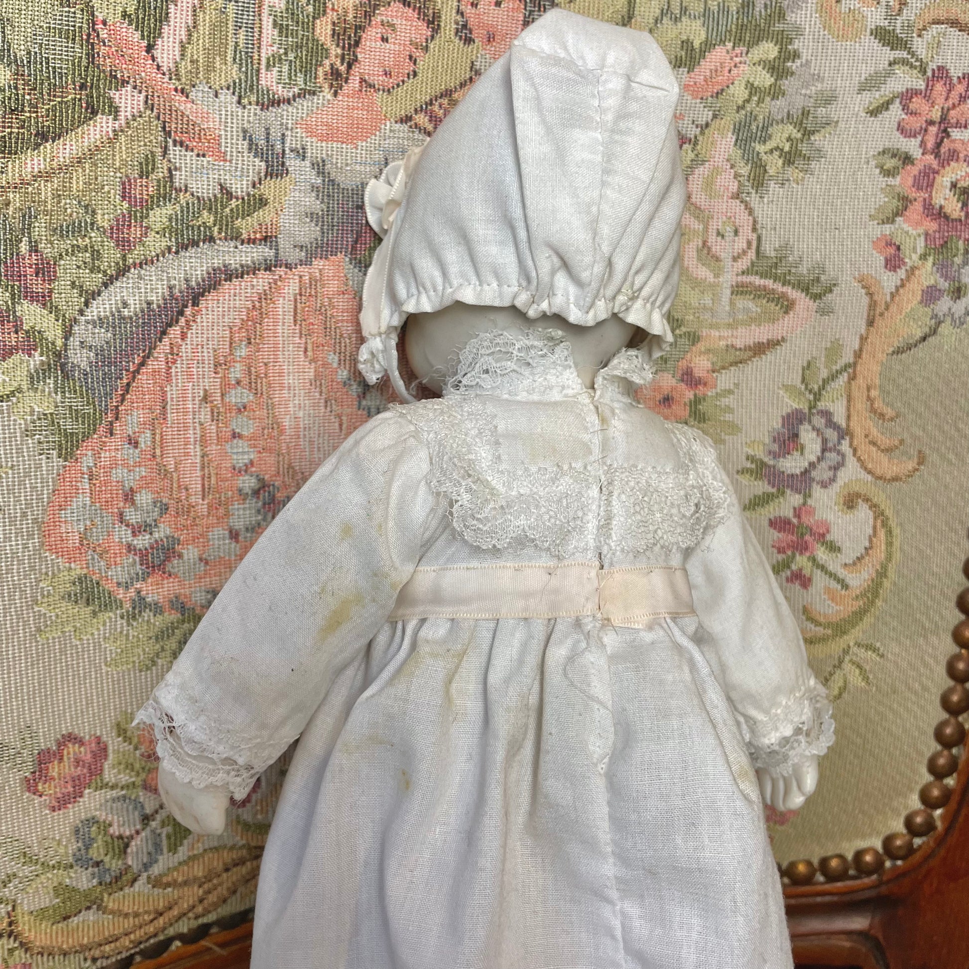 Cute porcelain doll in a baptism dress with an angelic small smile on the face. A really cute baptism gift or addition to a porcelain doll collection. Small stains on the dress, could be washed and cleaned but I sell it in the original state.