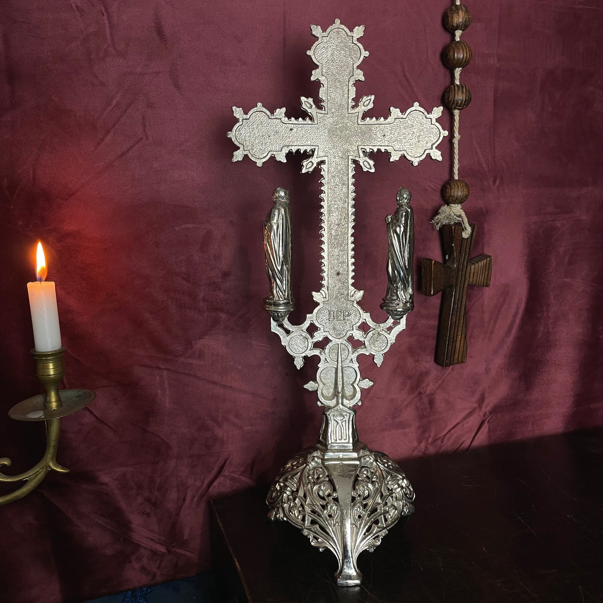 At the base, there are two removable side statues: Mary and Saint John, together with Jesus Christ, they form the so-called Calvary group, which is a common symbol in Continental altar crucifixes. On the backside it is branded ''DEP'', this comes from deposé in French. The scrolls, volutes, rounded feet, and decorative cartouches on the base resemble 18th-century Baroque, but executed in a late-19th-century revival style. The ornamentation is more sculptural than Gothic, with softer lines and heavier proportions.