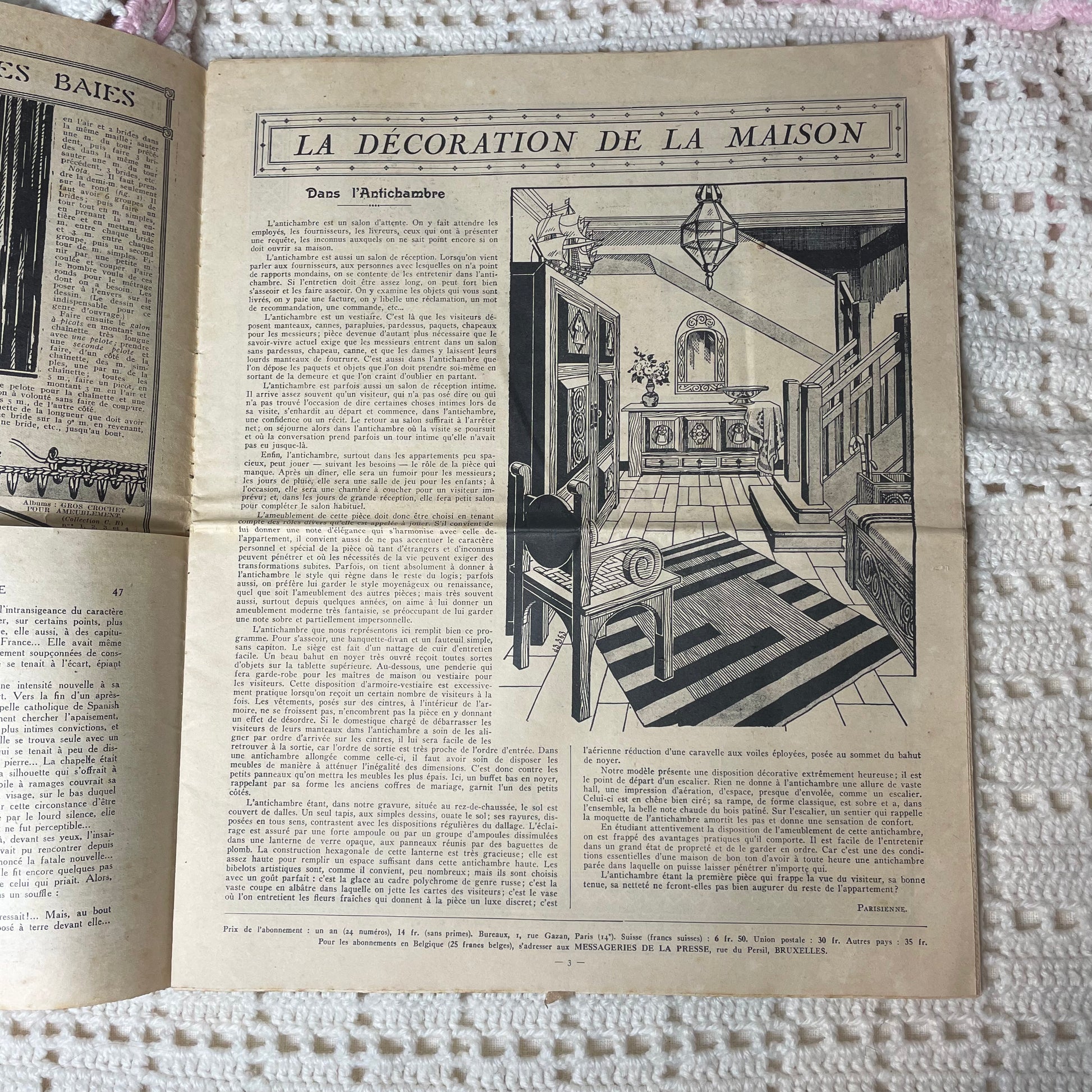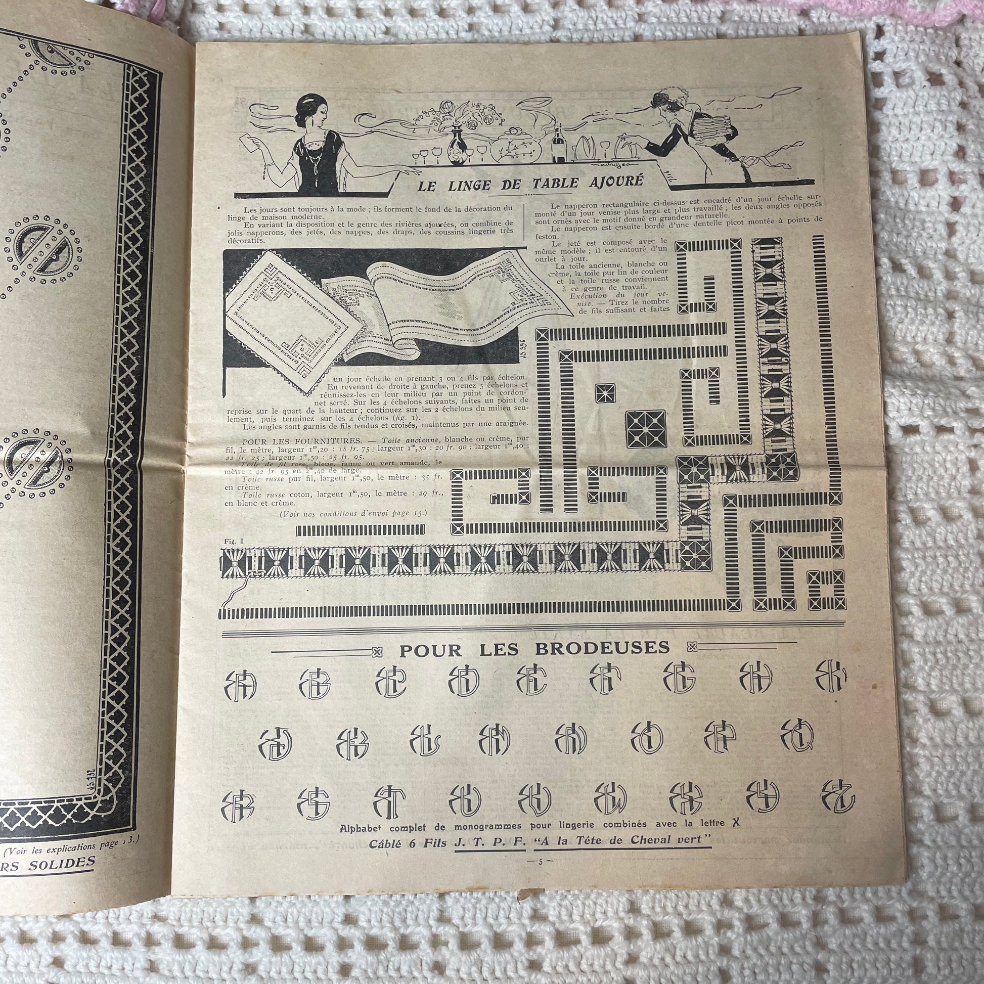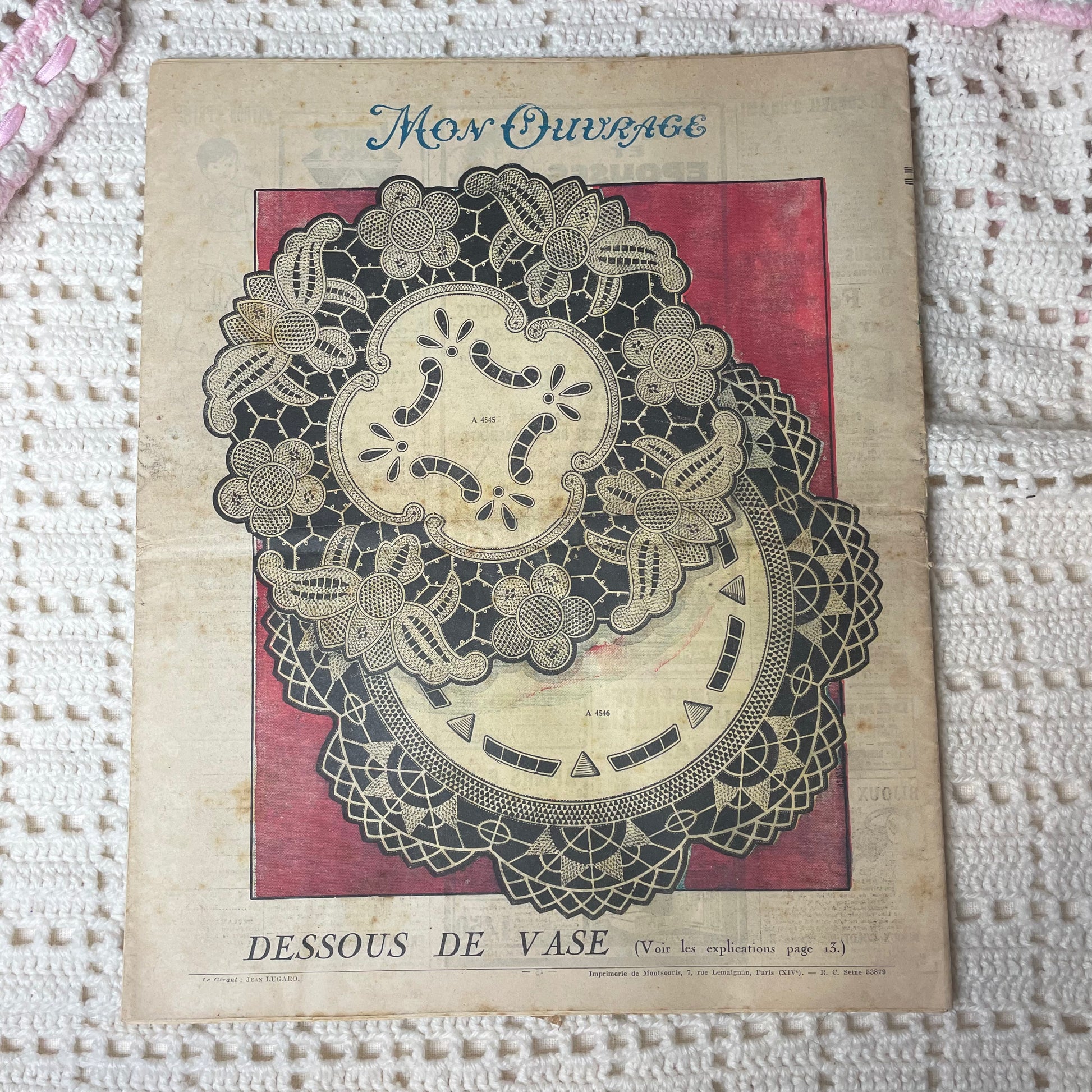 French fashion magazine with articles and instructions for crochet projects. Beautiful colored cover for this time. Still in great condition to add to your collection or research purposes.