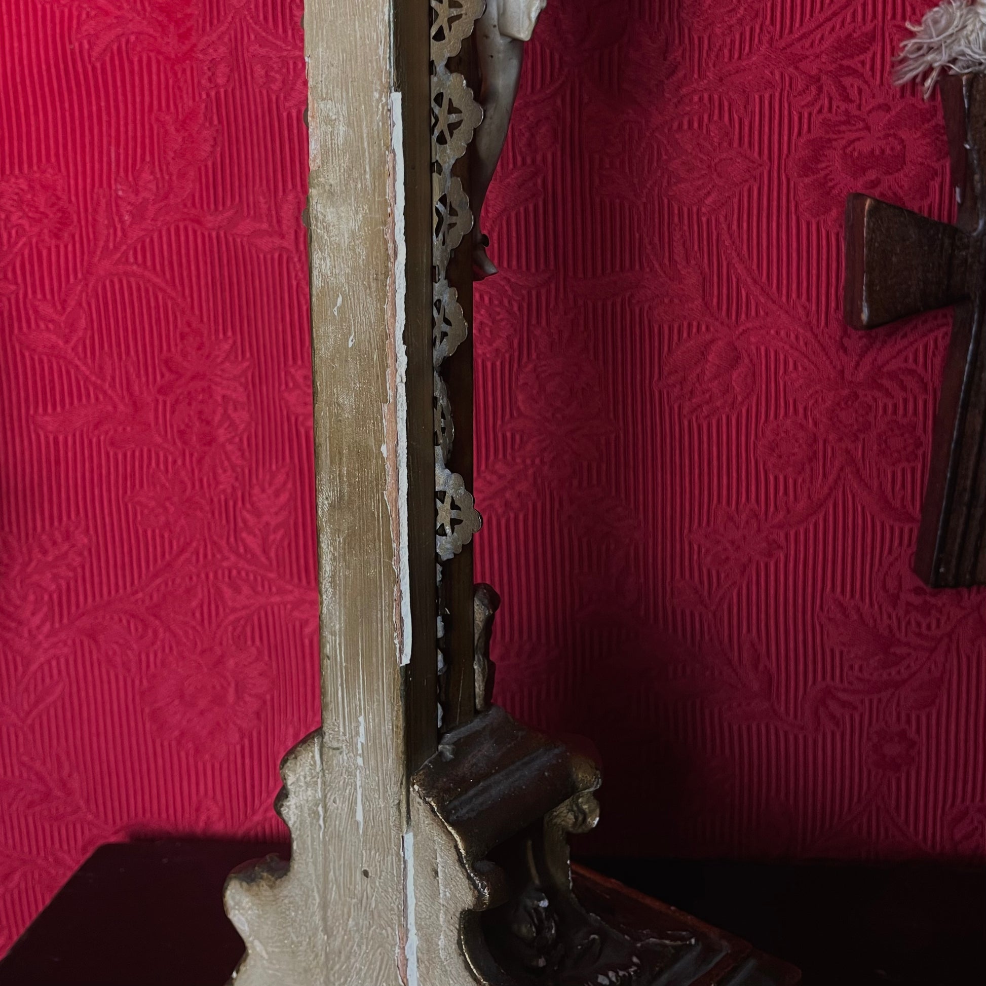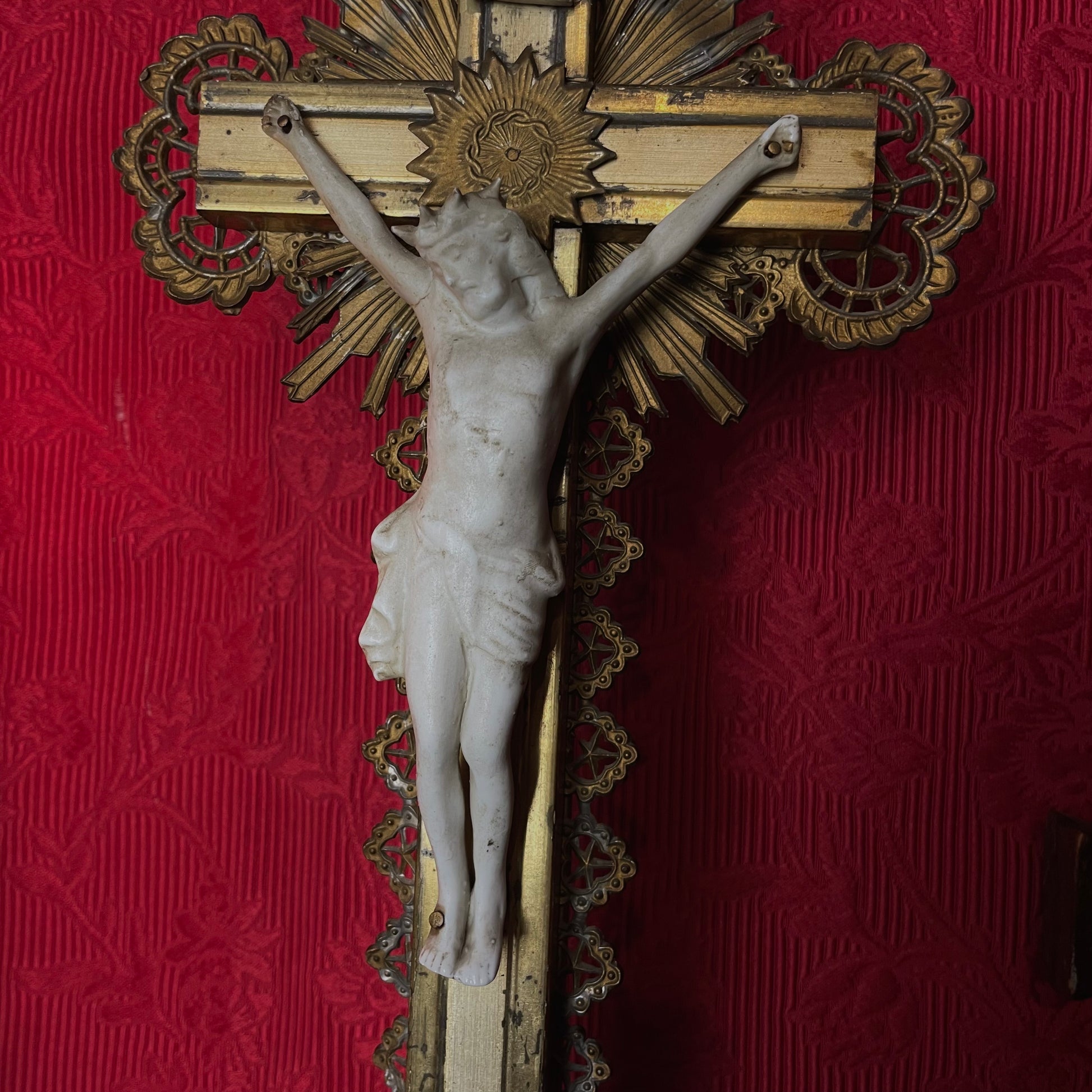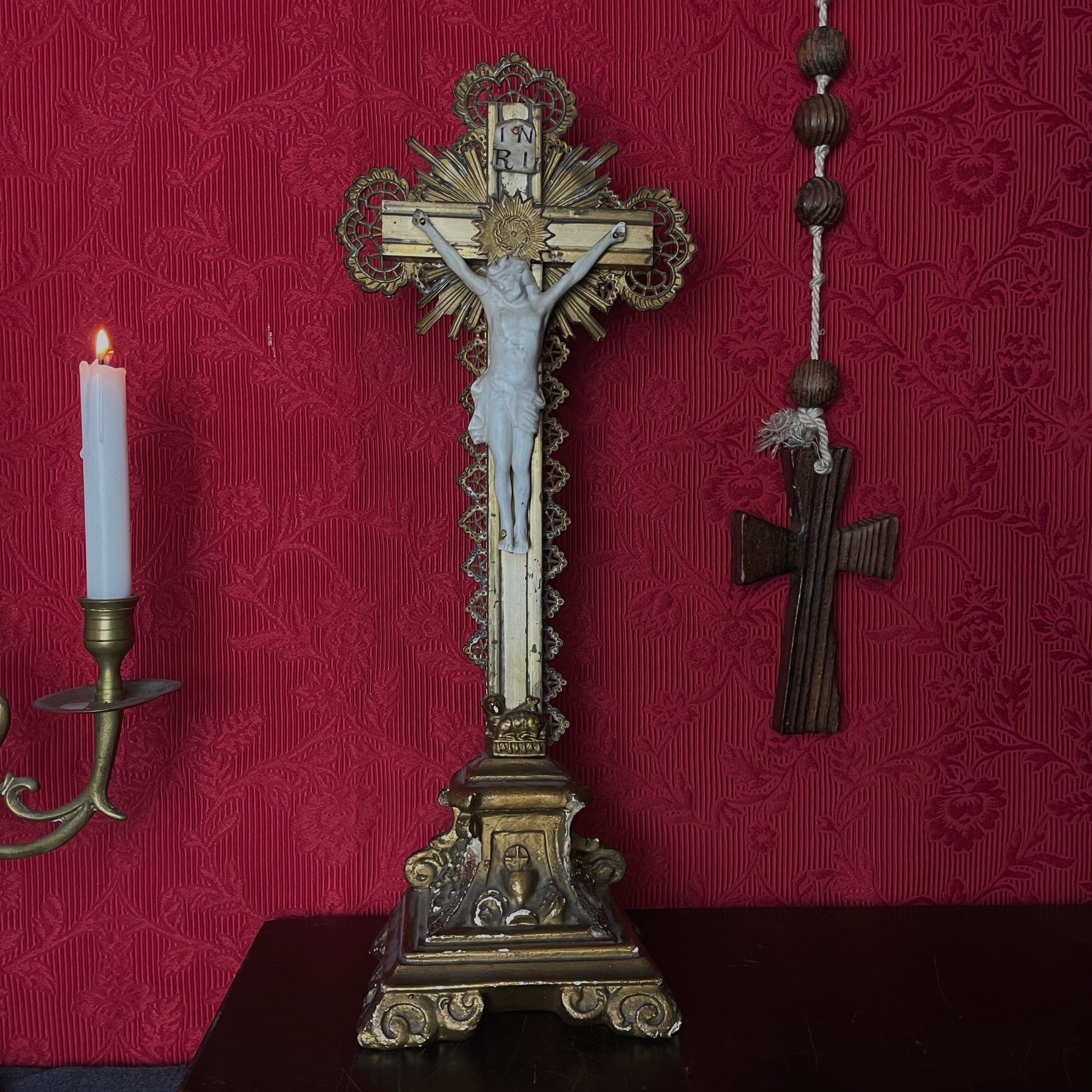 Altar crucifix from either France or Belgium in a neo-baroque/ rococo revival style. Made from wood and tin (very fragile), Jesus Christ is carved out of biscuit porcelain.