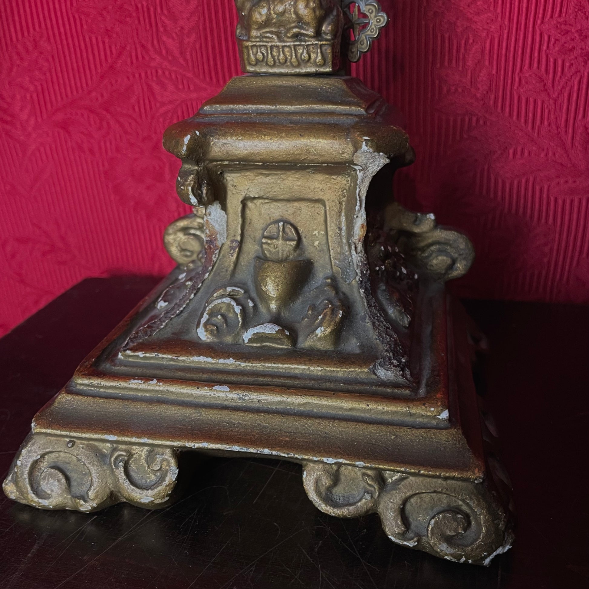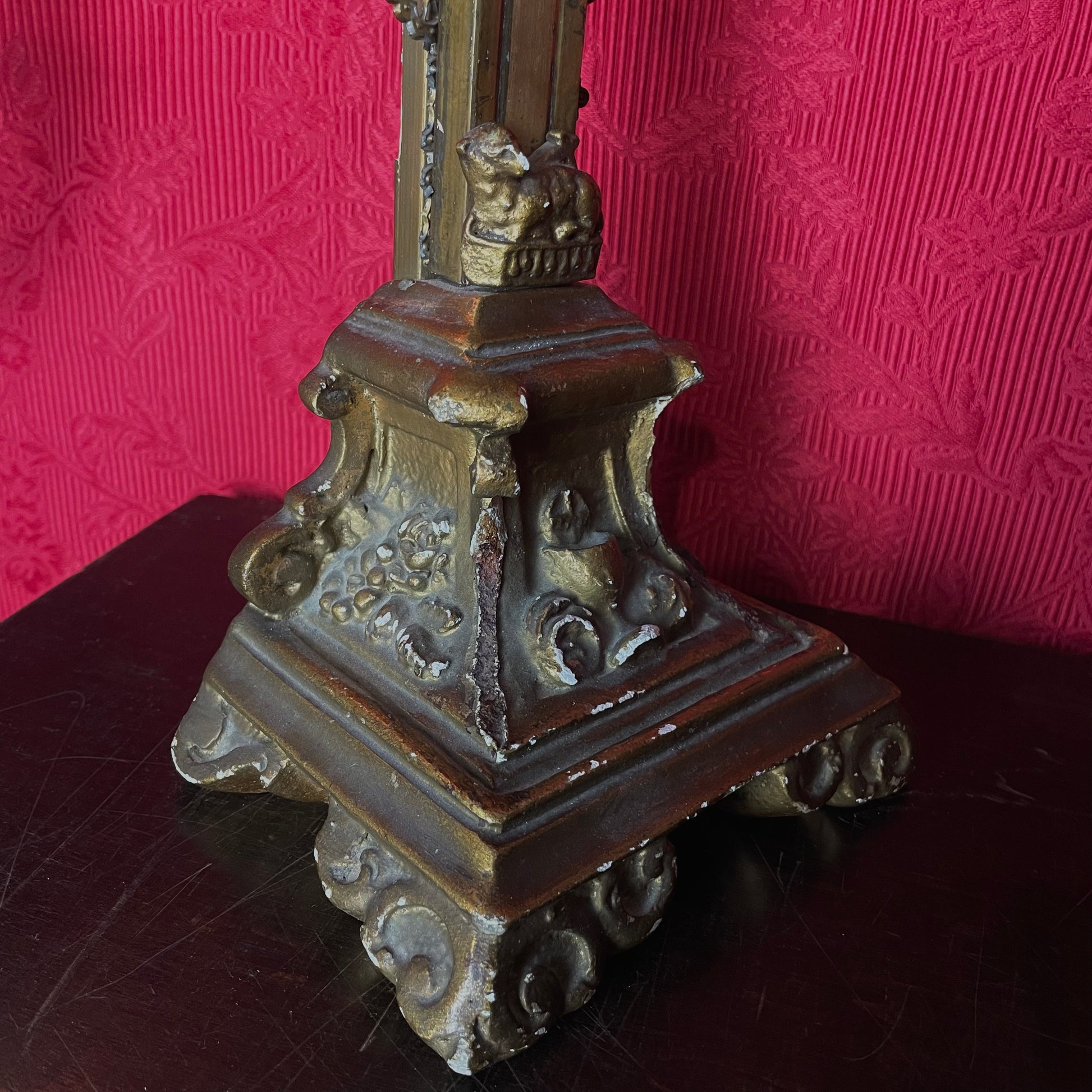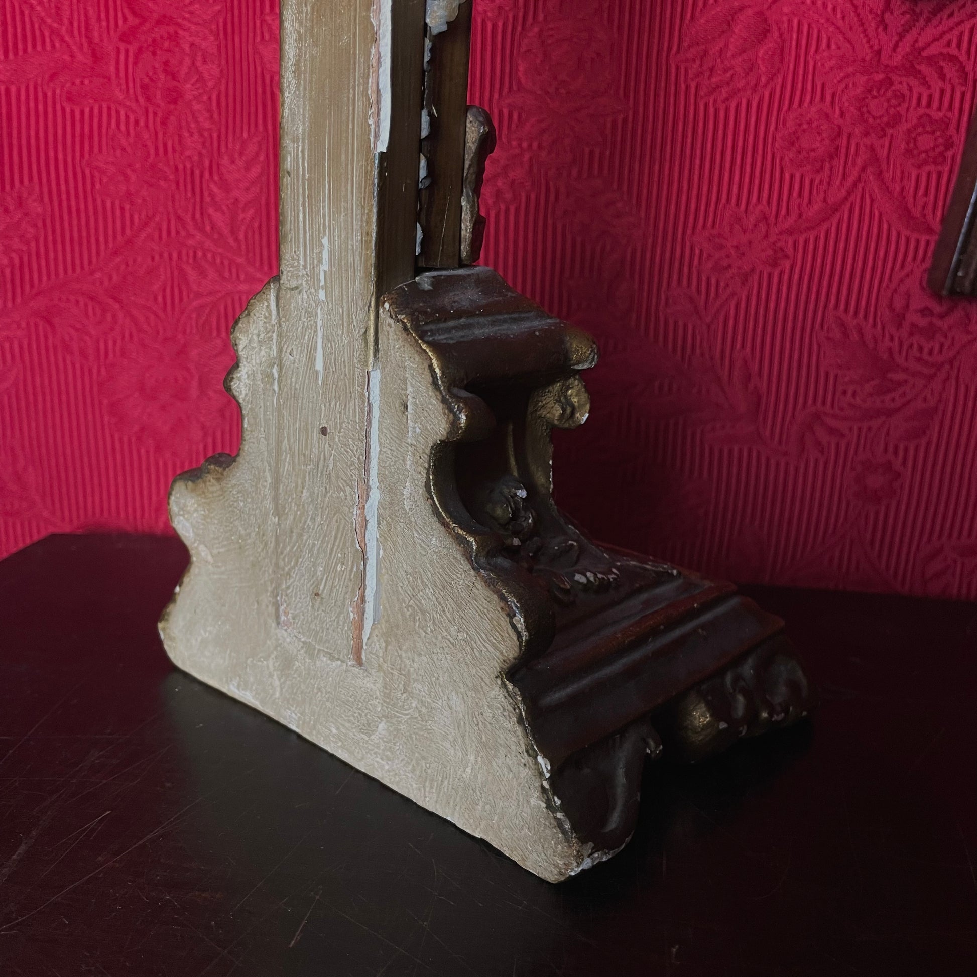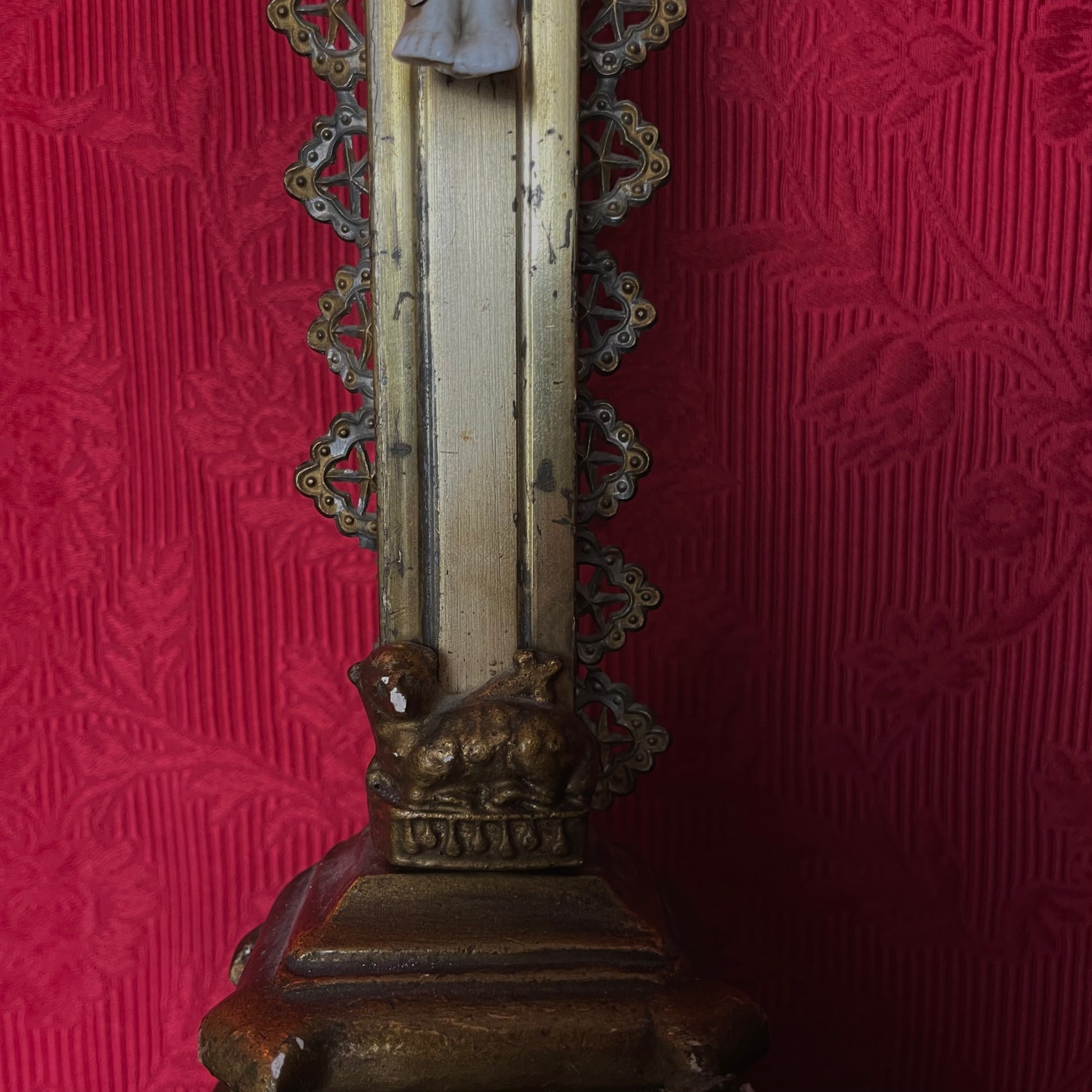 Altar crucifix from either France or Belgium in a neo-baroque/ rococo revival style. Made from wood and tin (very fragile), Jesus Christ is carved out of biscuit porcelain.