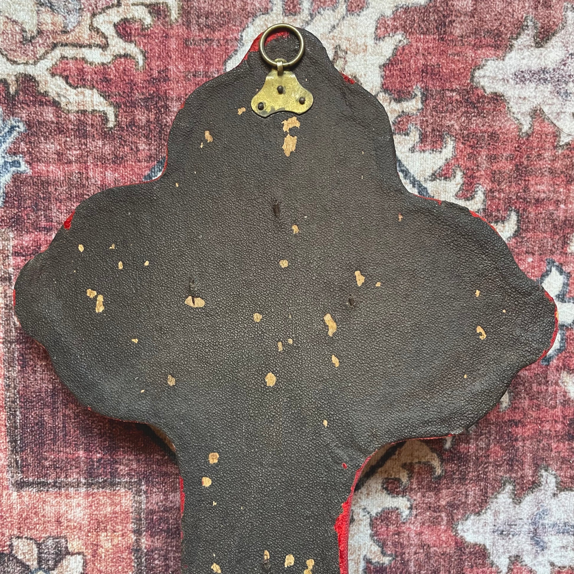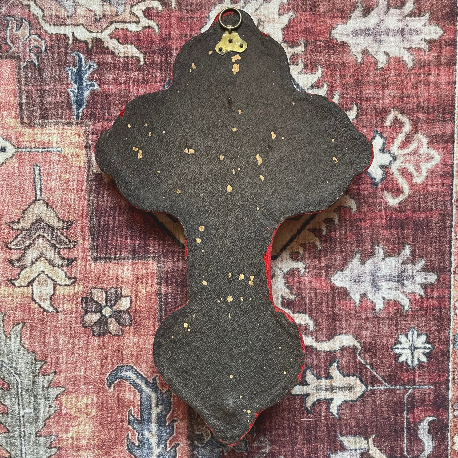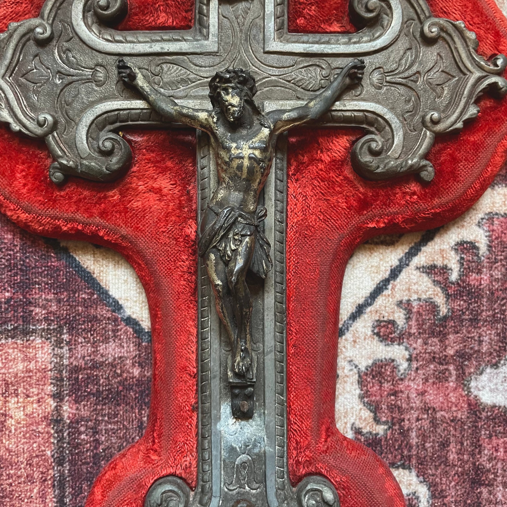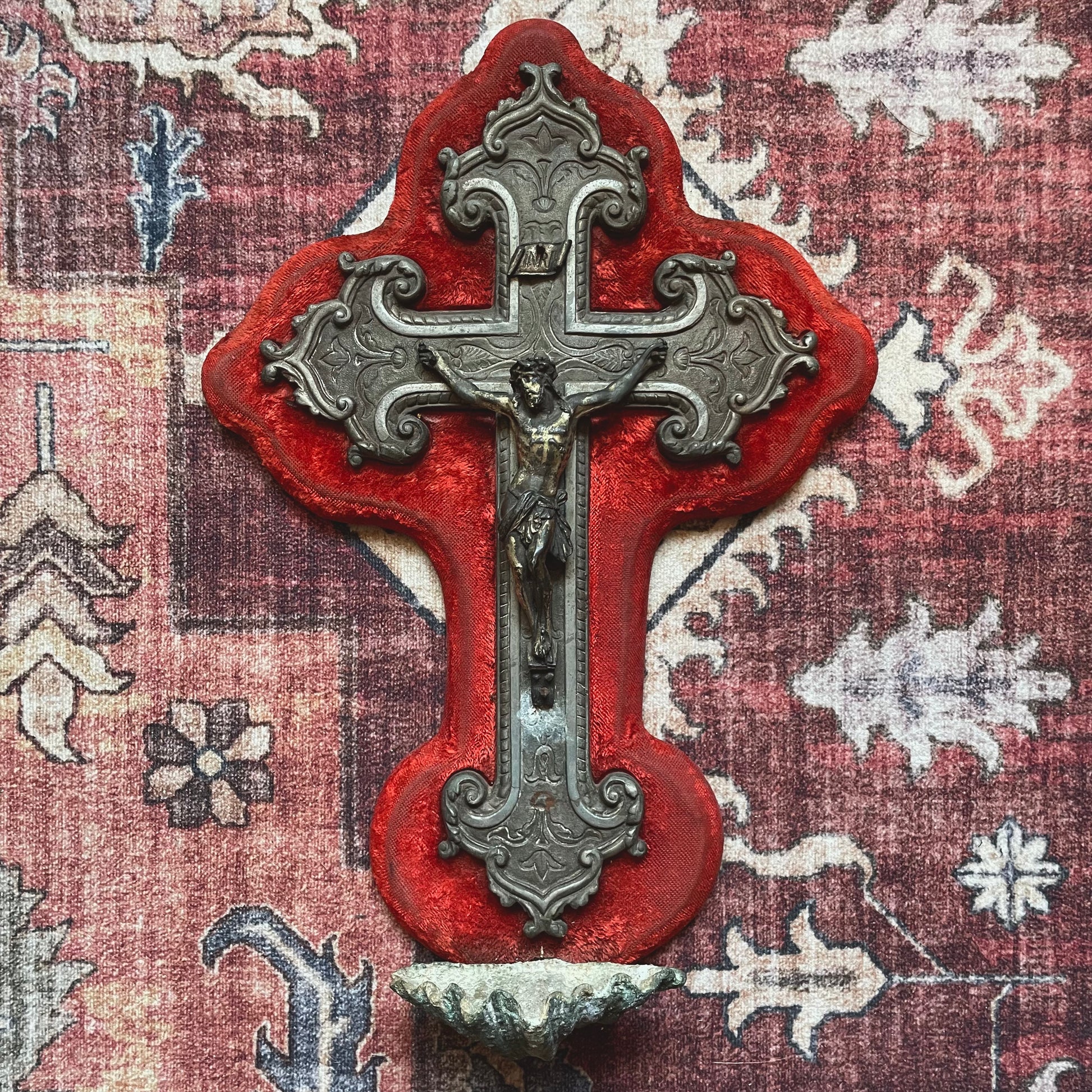 Neo-Baroque style Holy Water Font with red velvet backing. The ornate, carved stone cross with dense scrollwork is typical of the late-19th-century revival style. Note, this piece is very heavy, stone items are less likely to survive throughout the years. A stone devotional item is not common to find from this era.