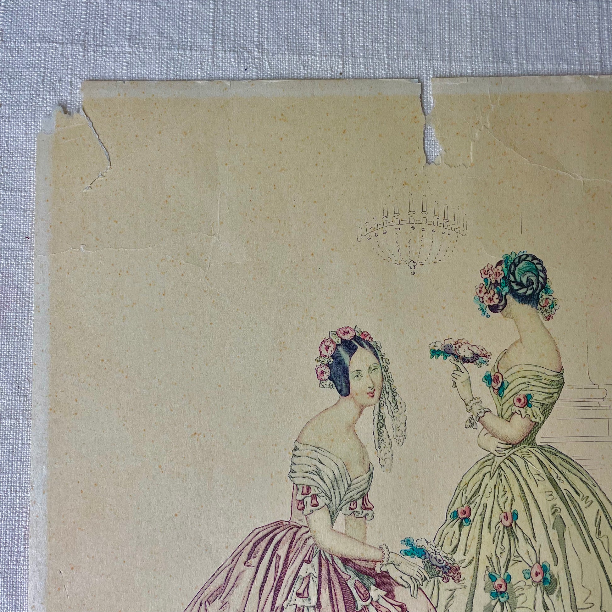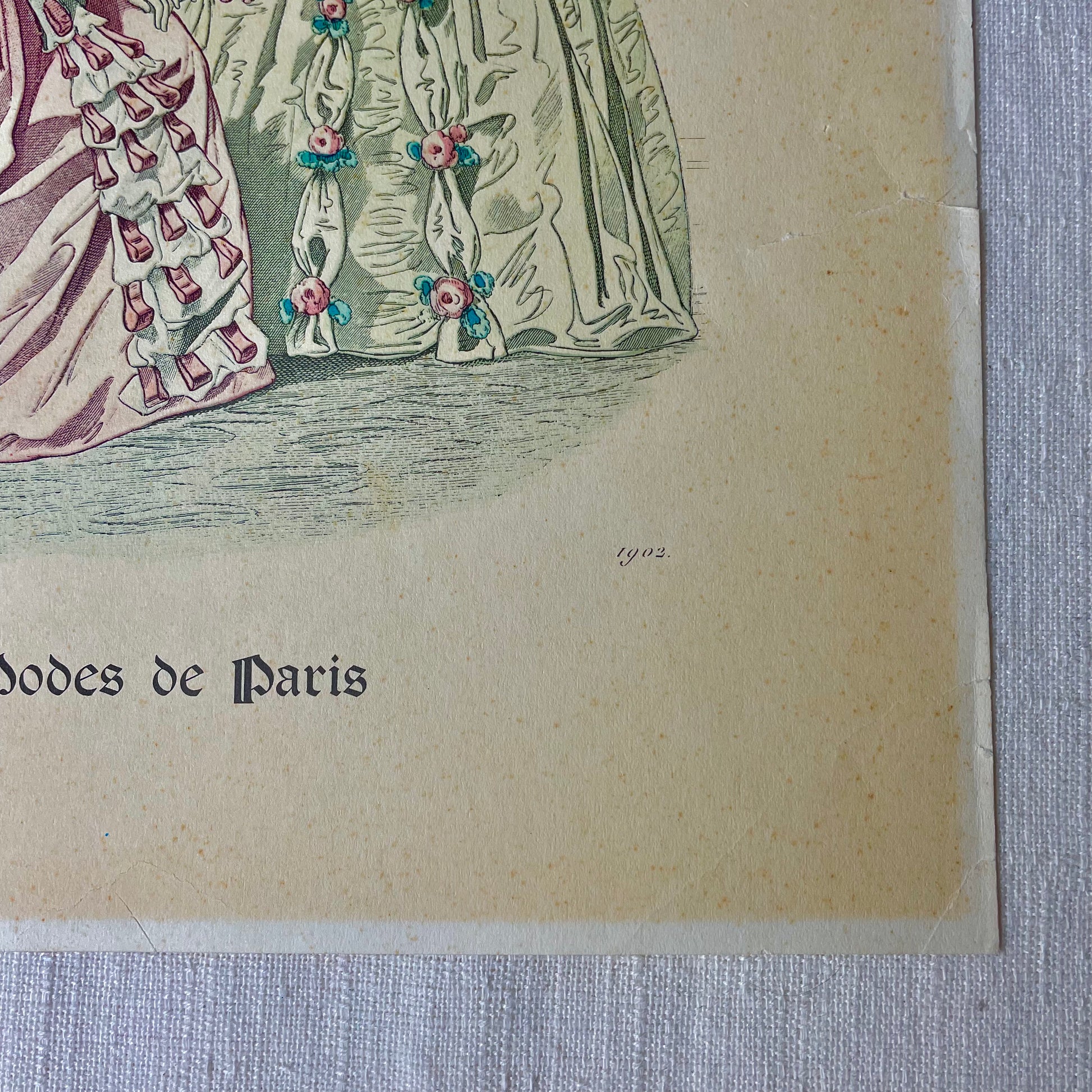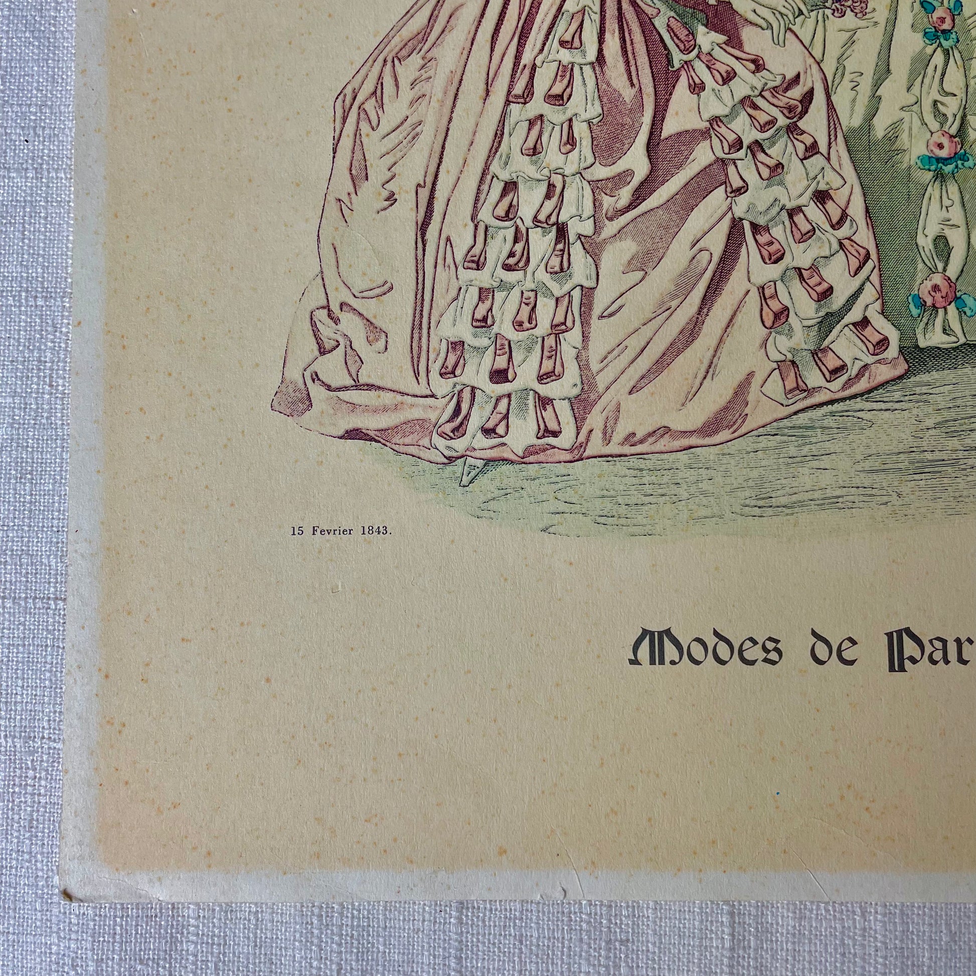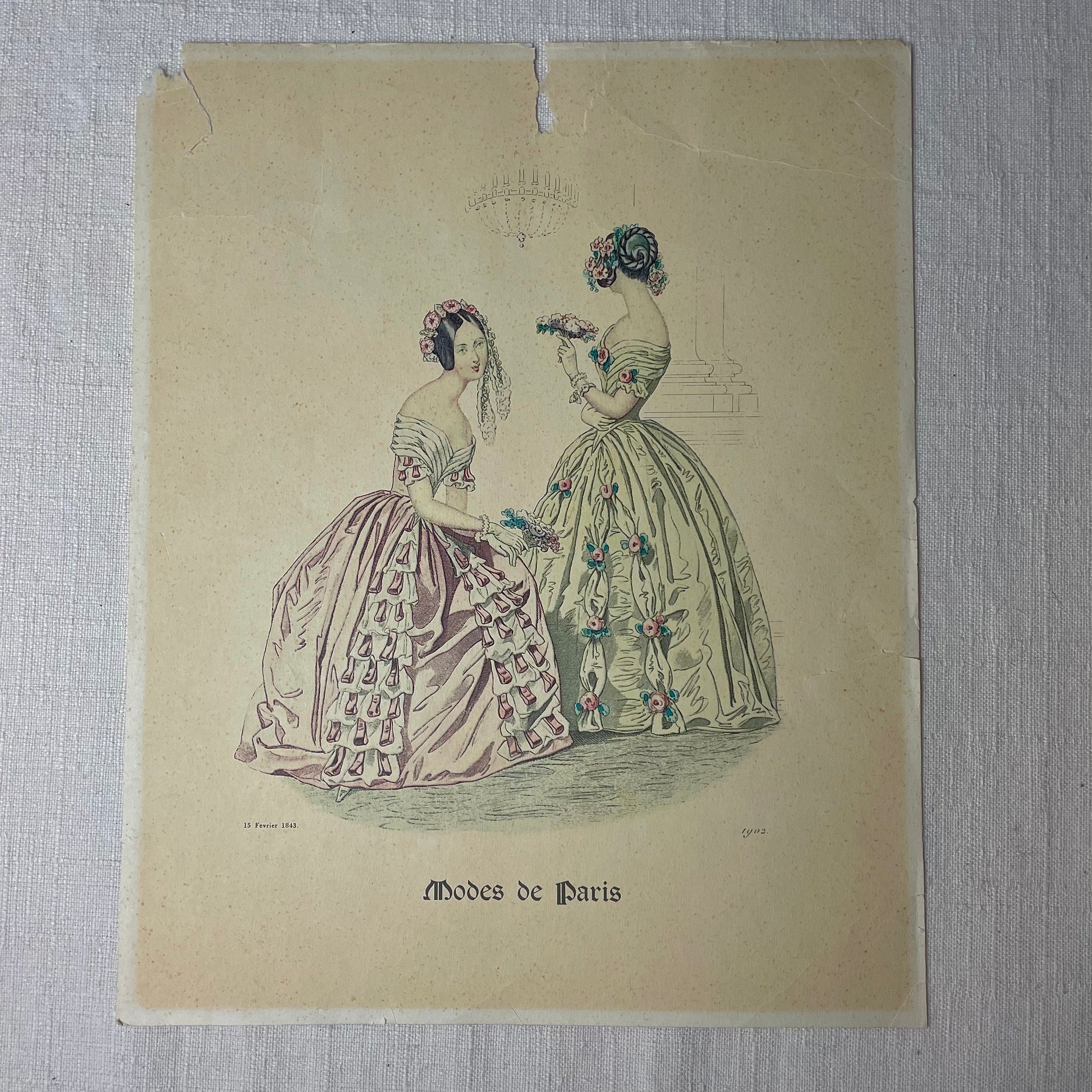 A paper fashion print from 1902 depicting the attire from 1843 from Paris, France. Has tears in the paper and tape on the back. No flaws on the picture itself.