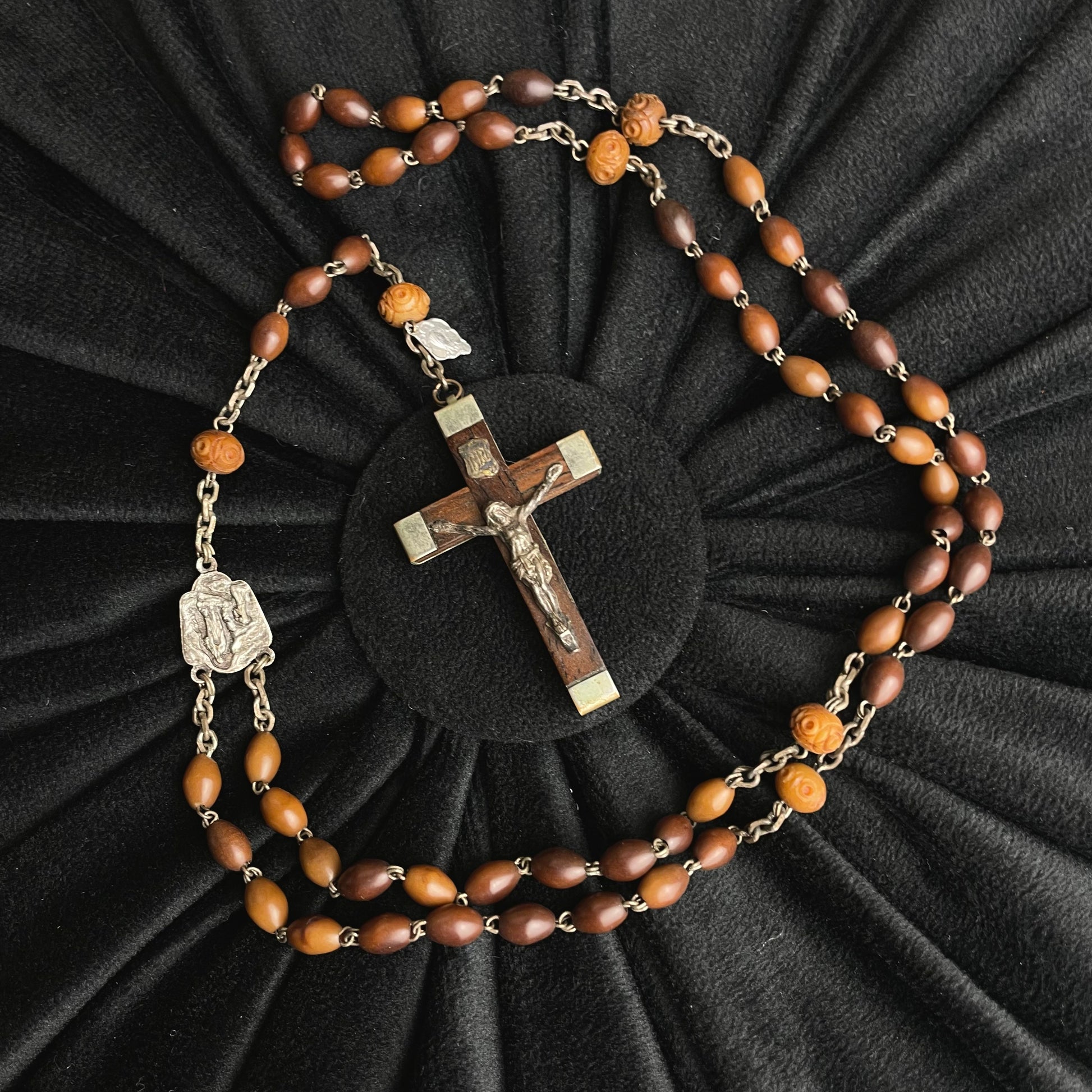 Beautiful vintage wooden rosary with Lourdes relic. A crucifix with a glass window containing a capsule with blue devotional glass ("Lourdes glass"). The blue colour is associated with the Virgin Mary. The blocky brass crucifix with a relic window is a known Lourdes pilgrimage style from that period.