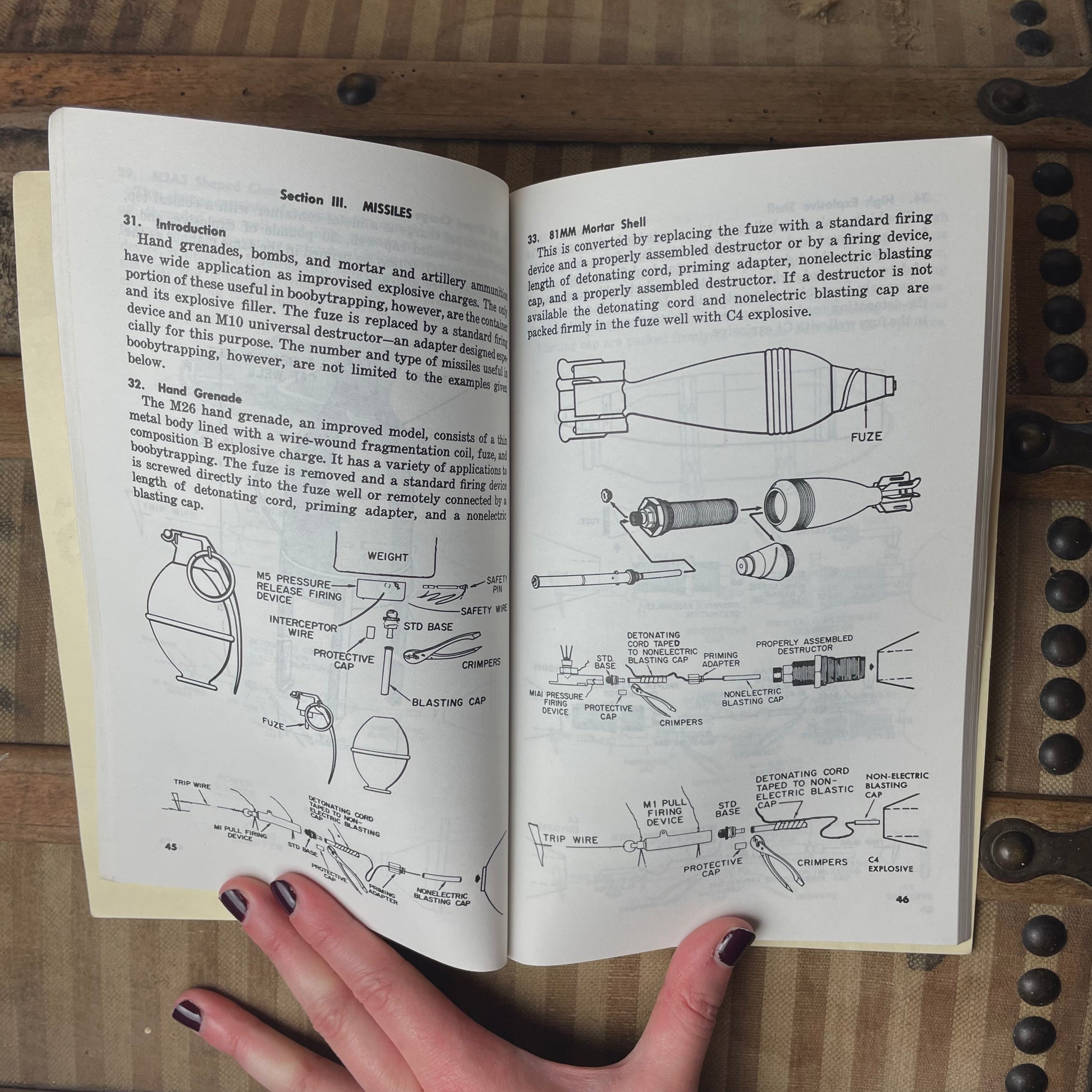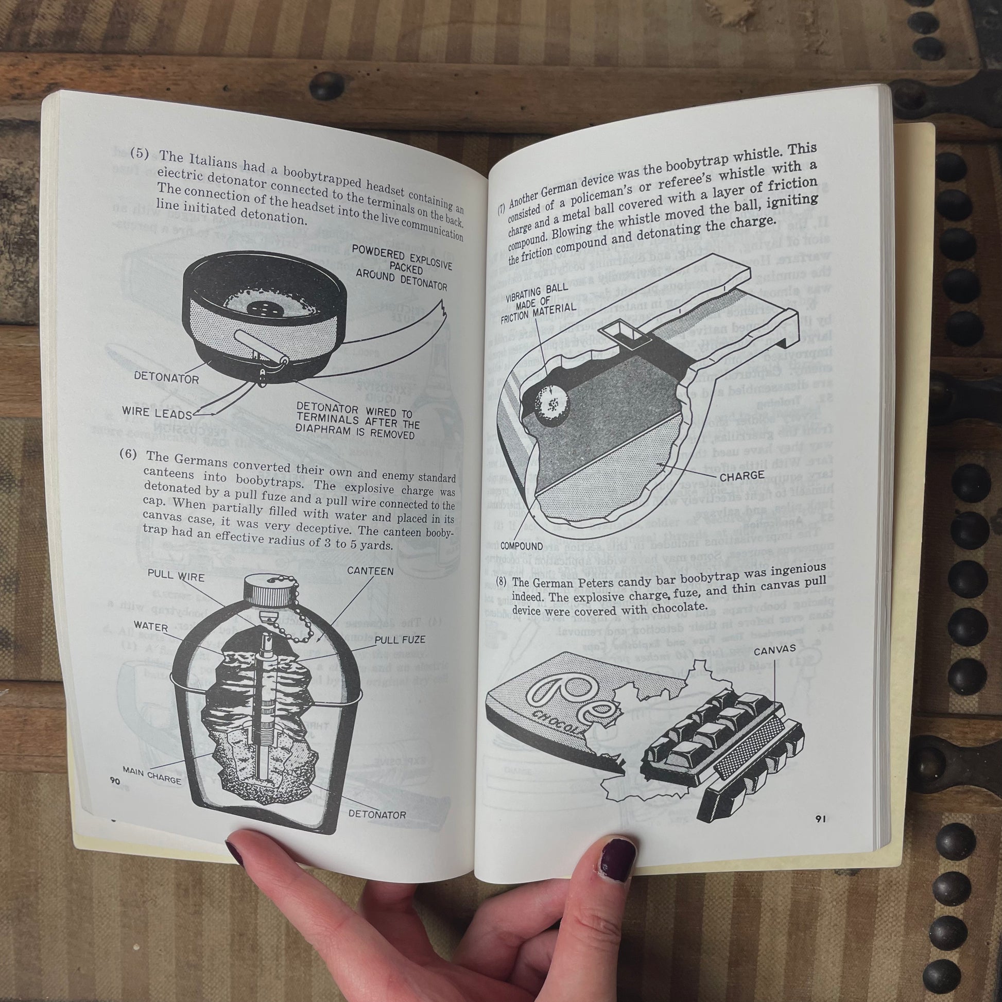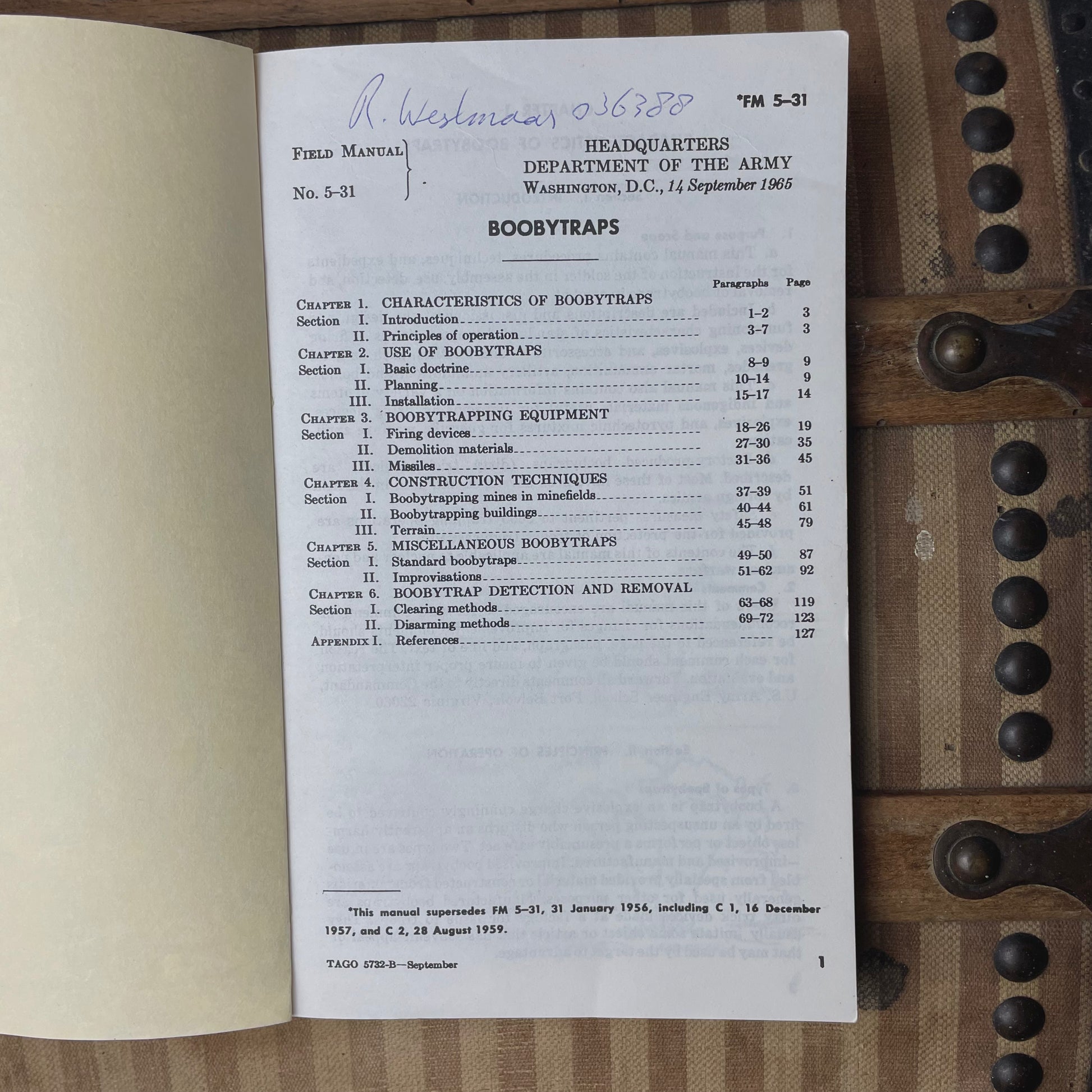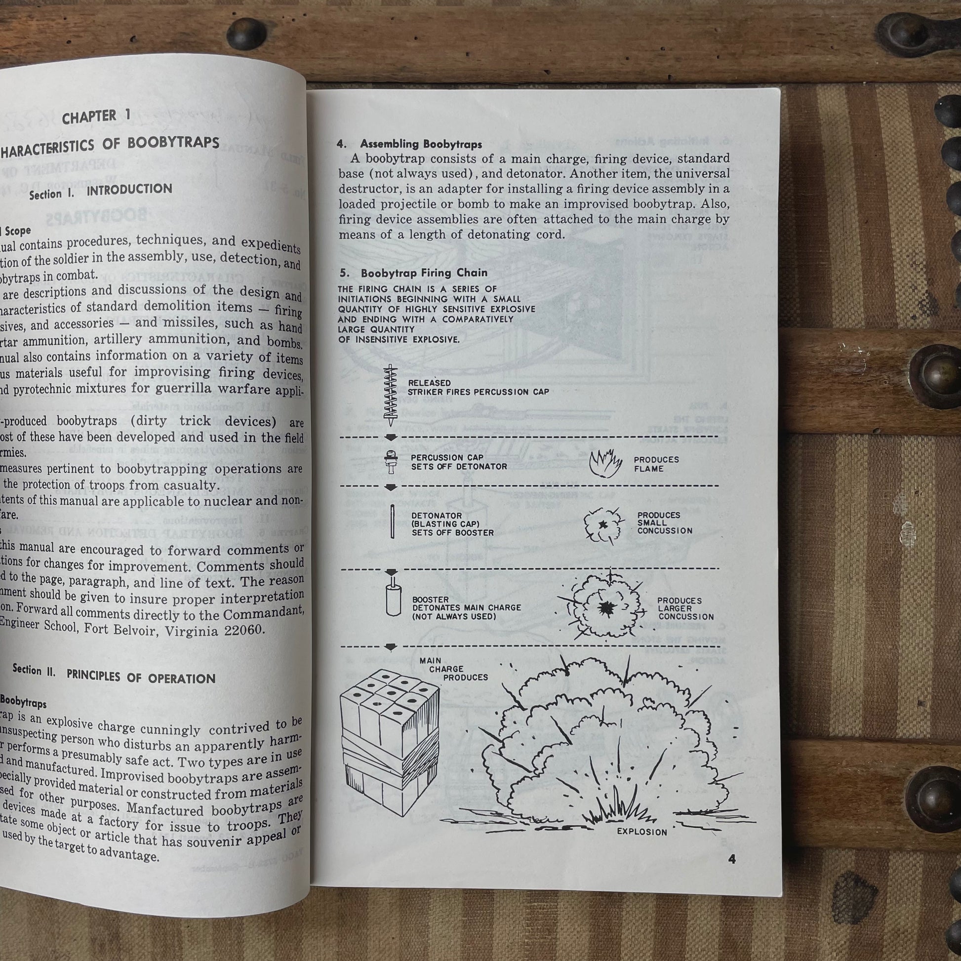Official classified US Army Manual ''Boobytraps'', dated 1965 with over 125 pages. Highly illustrated, extensive describing booby-traps, removal, placement, common enemy/vietcong style boobytraps, also german examples from WW2. Such manuals would be carried by special units. First print in this size, difficult to find nowadays.