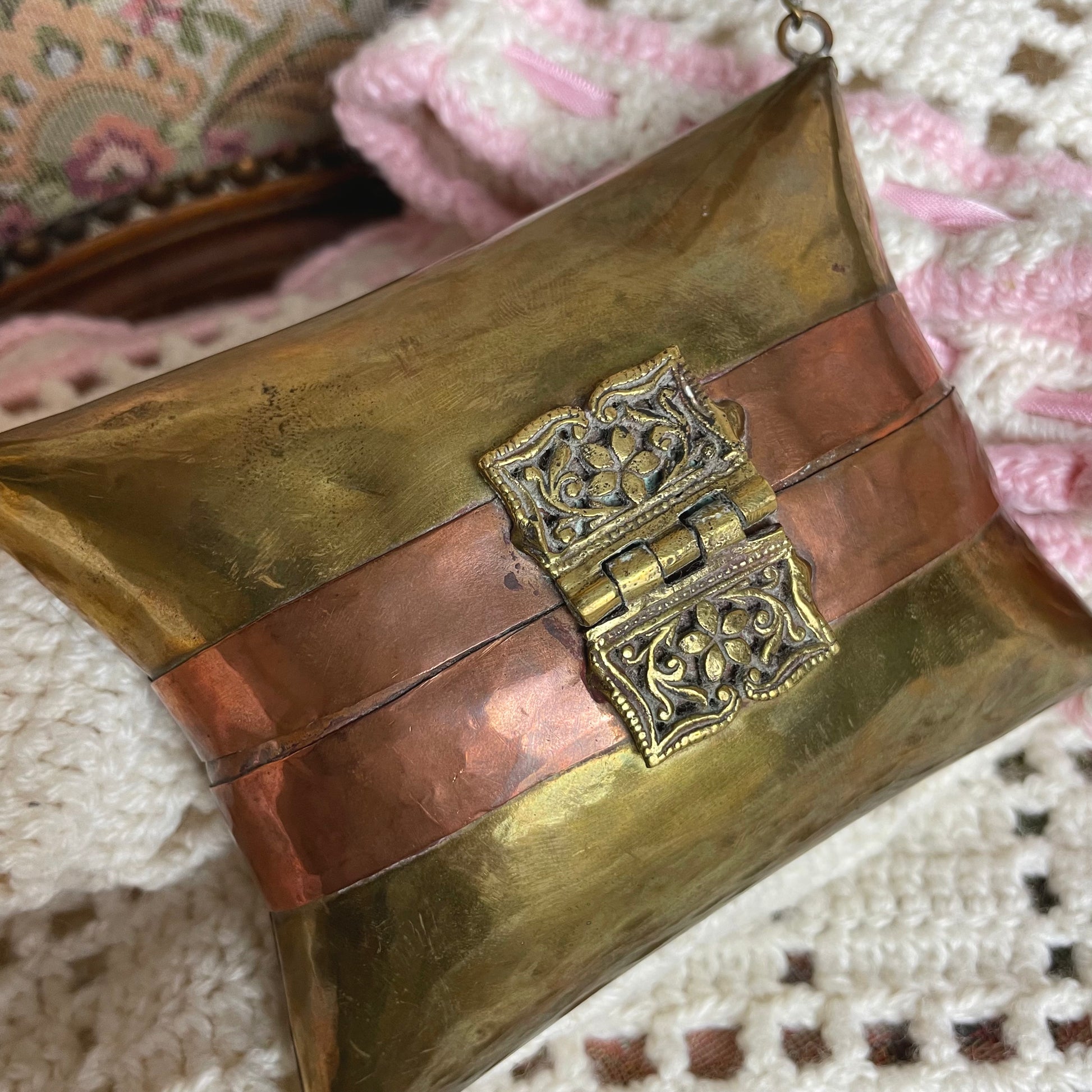 Stunning and whimsical 1970s brass and copper pillow purse. Pillow purses were populair in India during the 1970s and 1980s. This one is adorned with dark purple velvet on the inside.