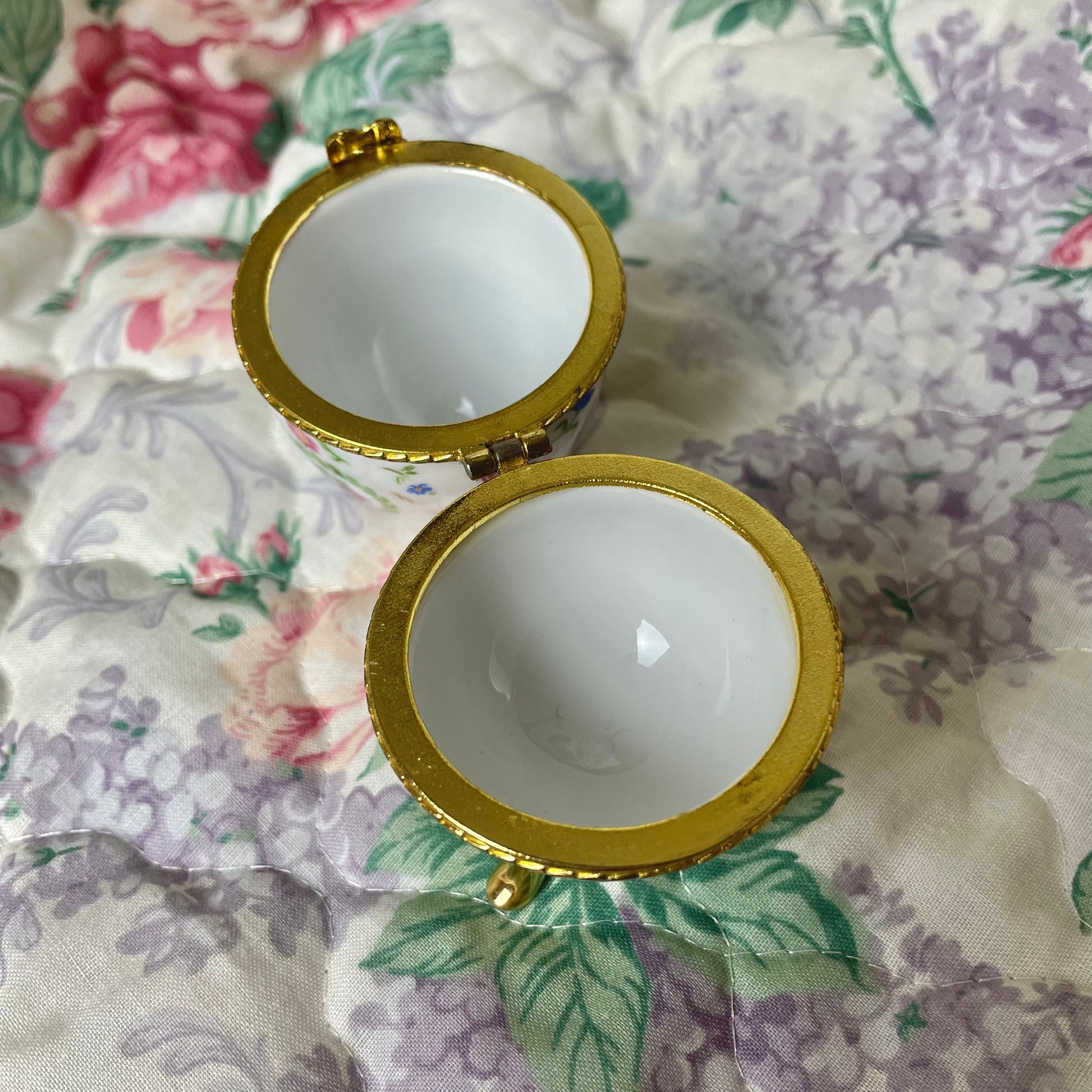 Stunning and sweet porcelain egg-shaped trinket box from the 1980s. Decorated with a flowery pattern and bow-like closure. Closure is in good condition.